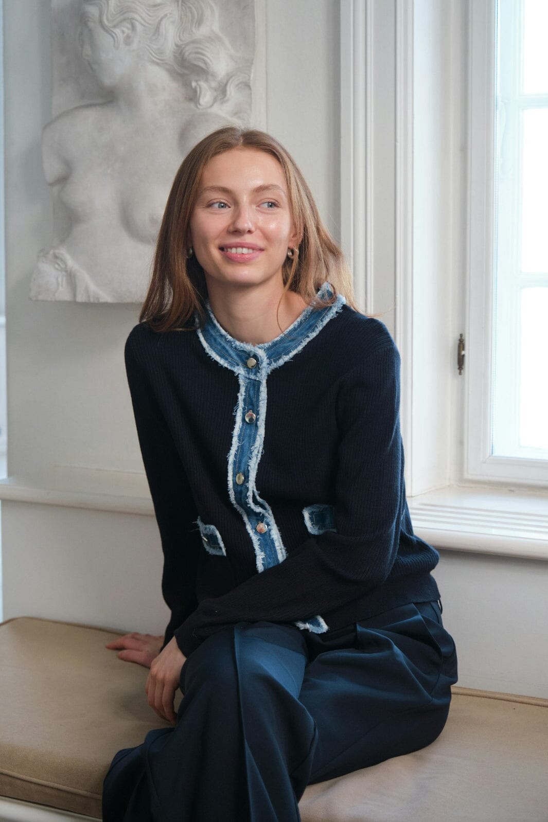 Dunkelblaue Strickjacke von Neo Noir mit Denimkanten am Kragen und den Taschen. Die Jacke hat Knöpfe vorne und Rüschendetails, die einen sanften Akzent setzen.
