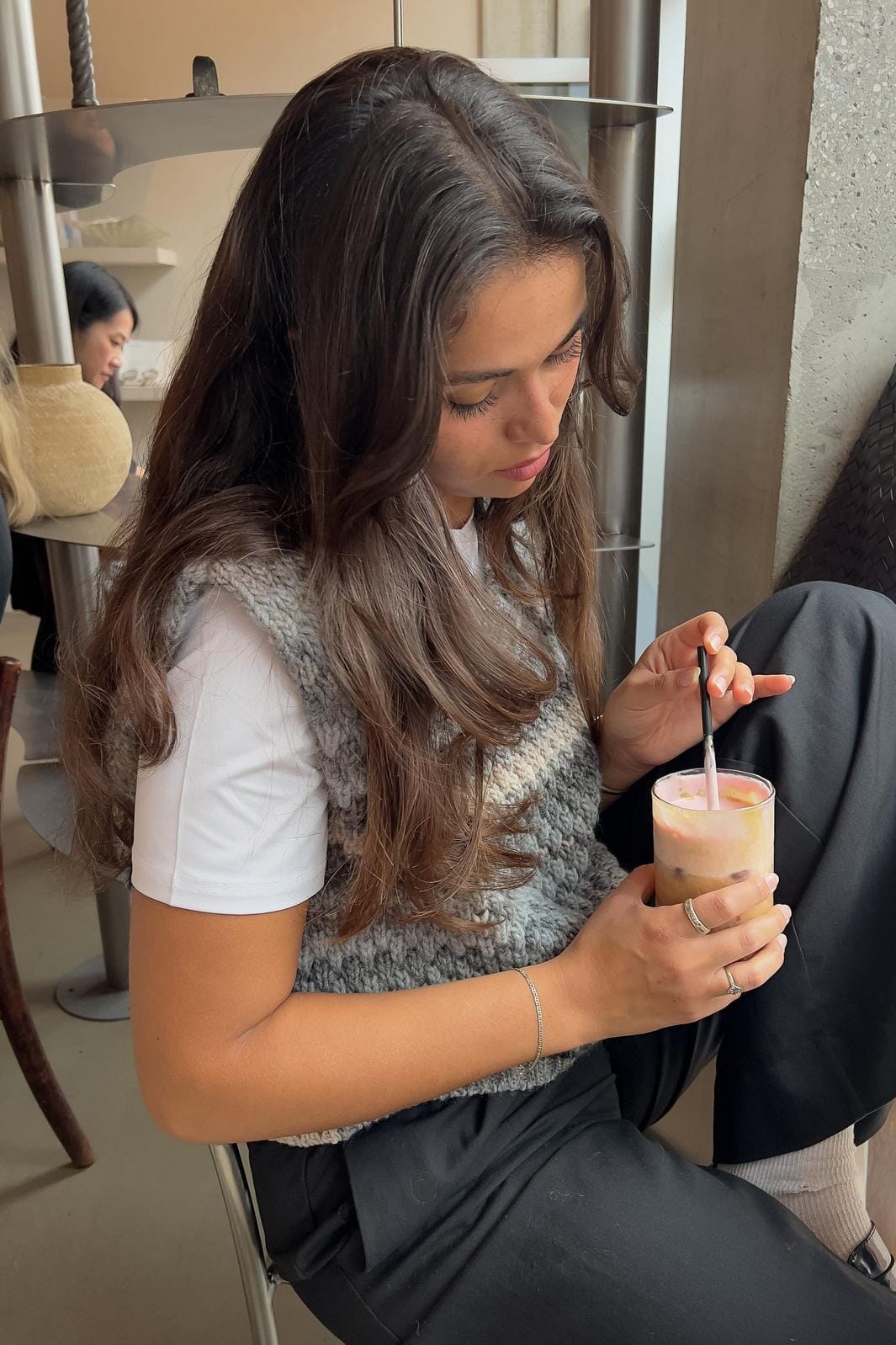 Strickweste von Noella in hellgrauen und beigen Nuancen. Die Weste hat einen groben Strickstil mit einem melierten Streifenmuster.