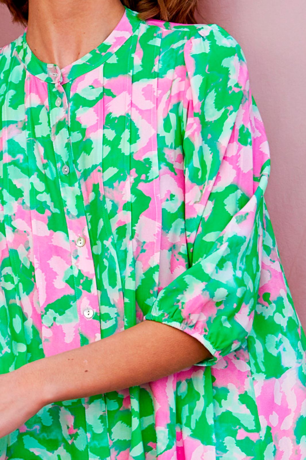 Hemdblusenkleid von Noella in Grün und Pink mit einem abstrakten Camouflage-Muster. Das Kleid hat eine Knopfleiste vorne und einen Hemdkragen mit 3/4-Ärmeln.