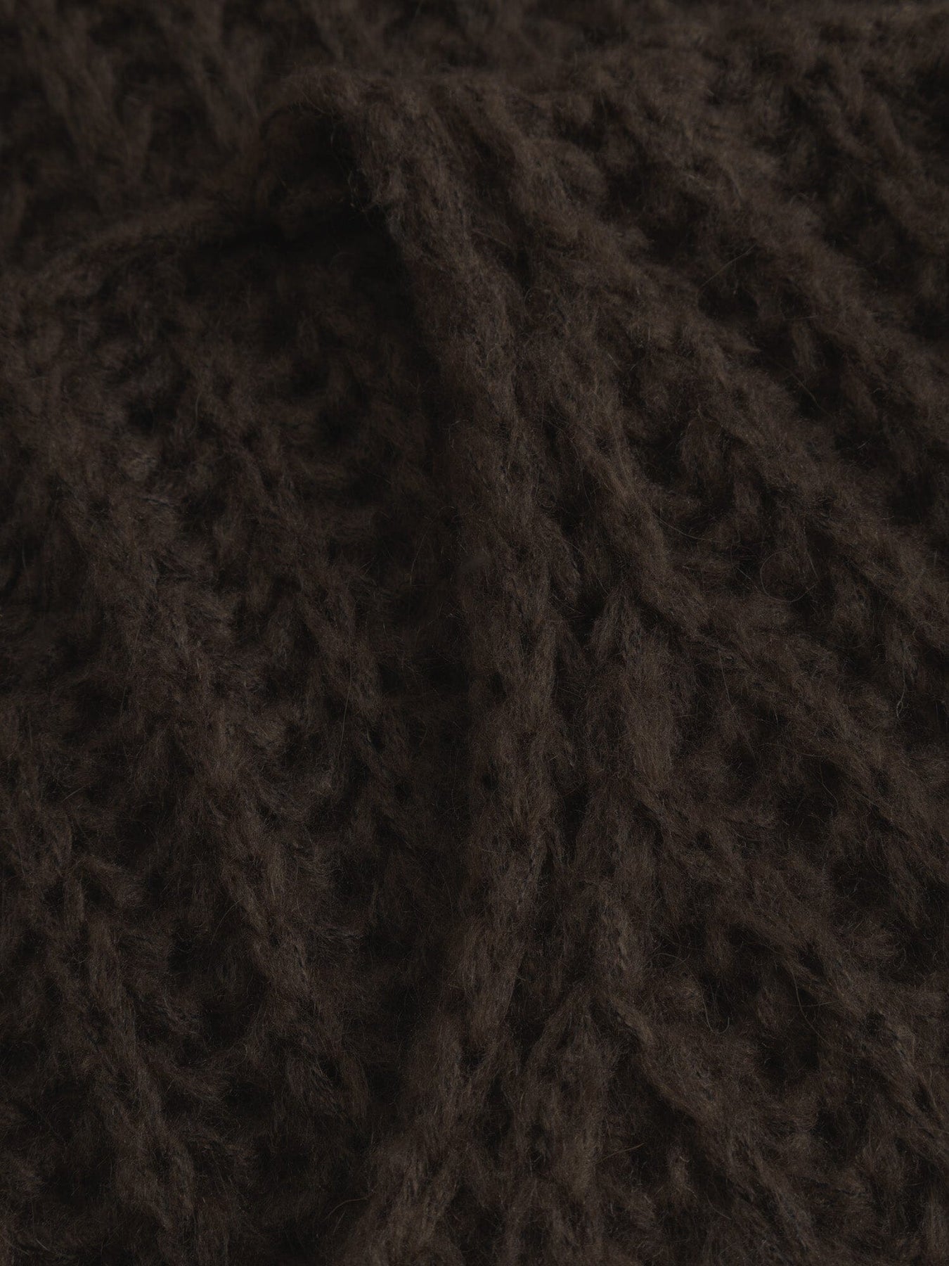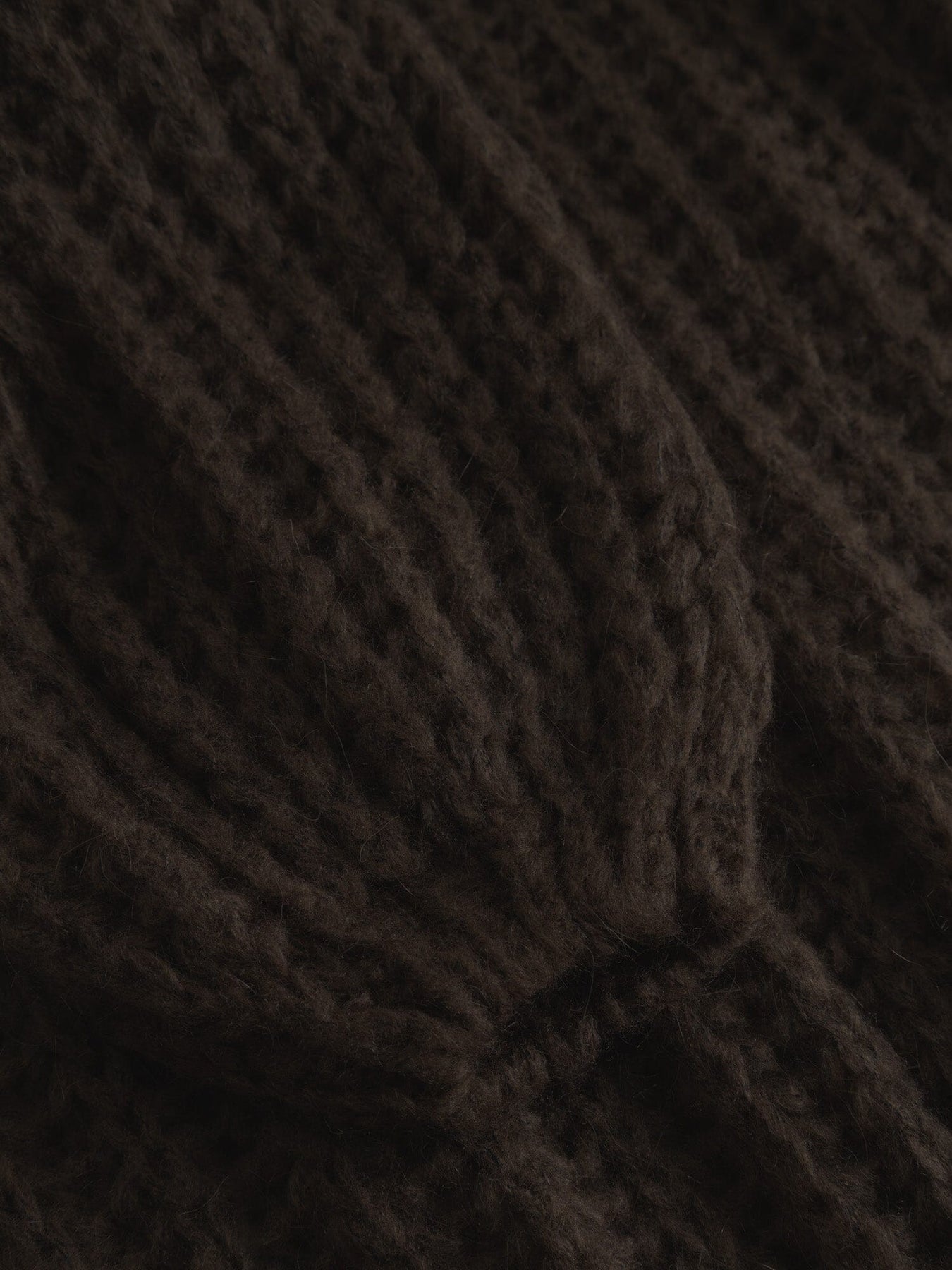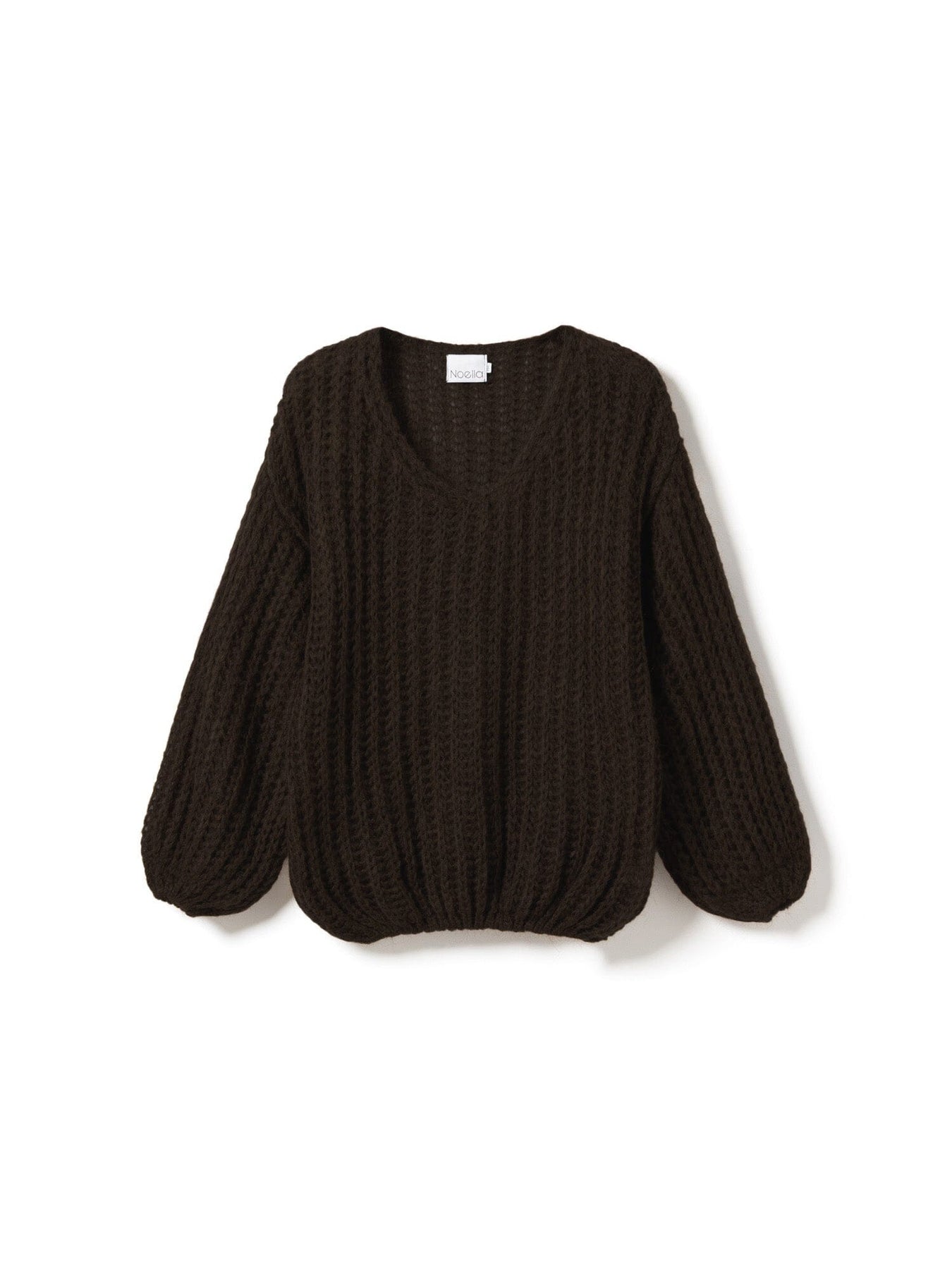 Dunkelbrauner Strickpullover von Noella mit einer Rippstrickstruktur und voluminösen Ärmeln. Der Pullover hat eine lockere Passform und abgesenkte Schultern.