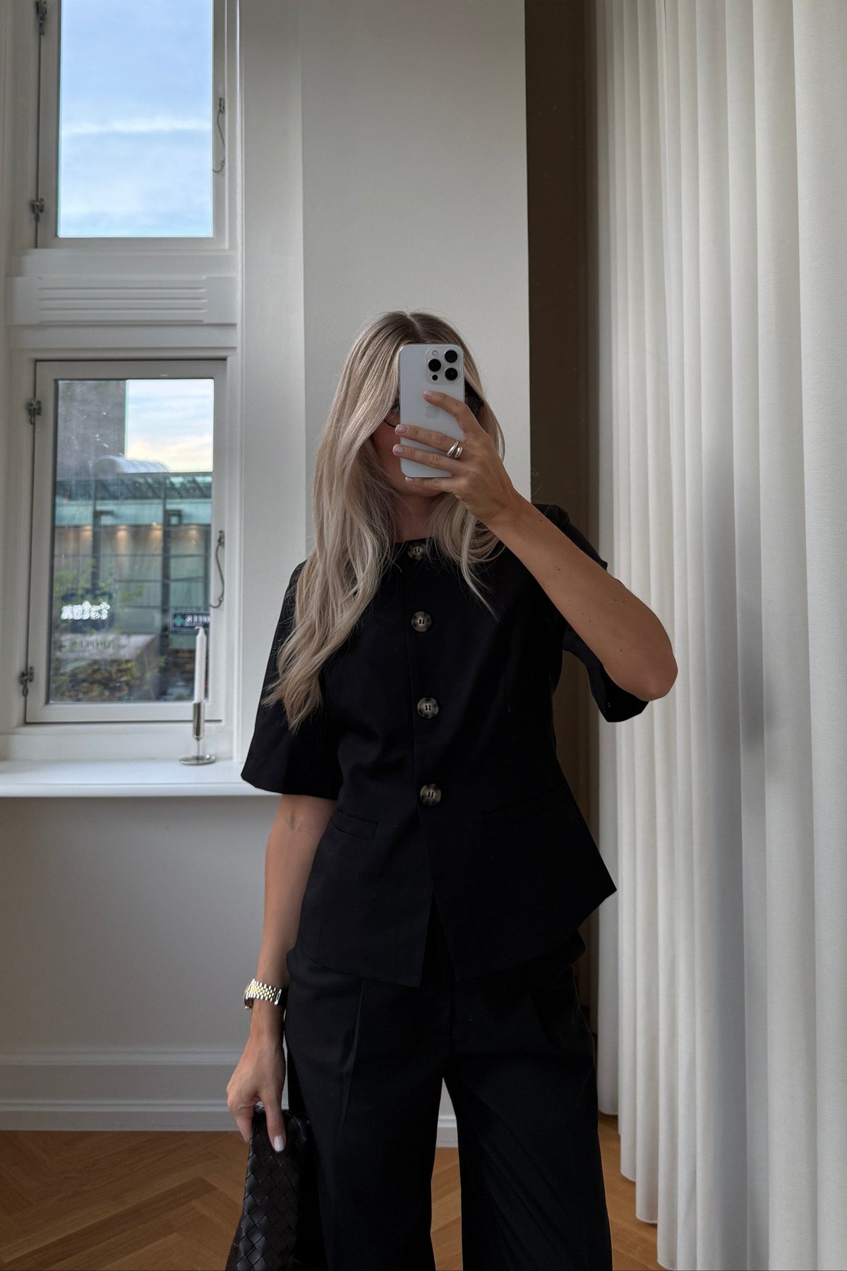 Schwarzer Blazer von Noella mit kurzen Ärmeln und rundem Ausschnitt. Große Knöpfe zieren die Vorderseite, und zwei Seitentaschen verleihen dem Blazer ein praktisches Design.