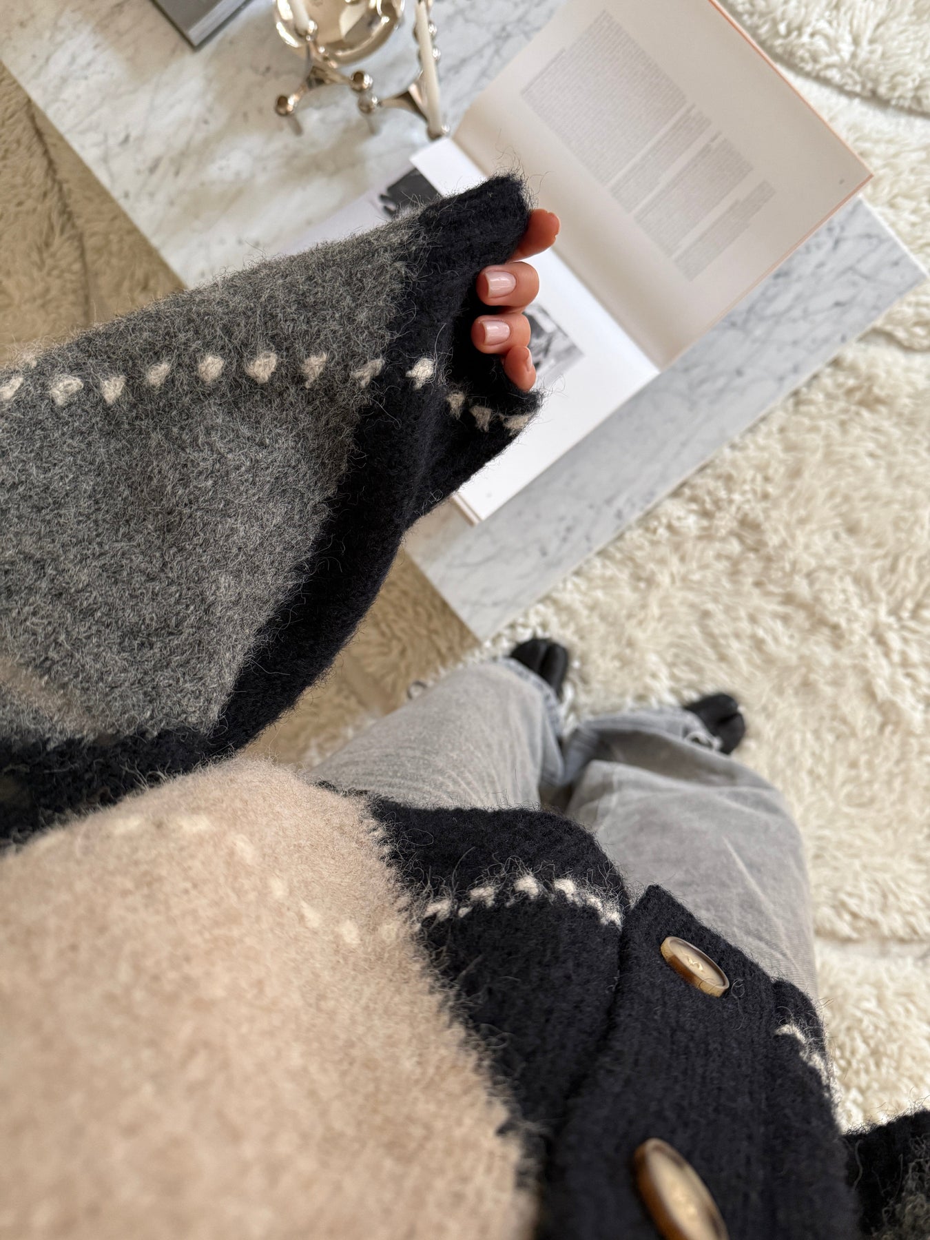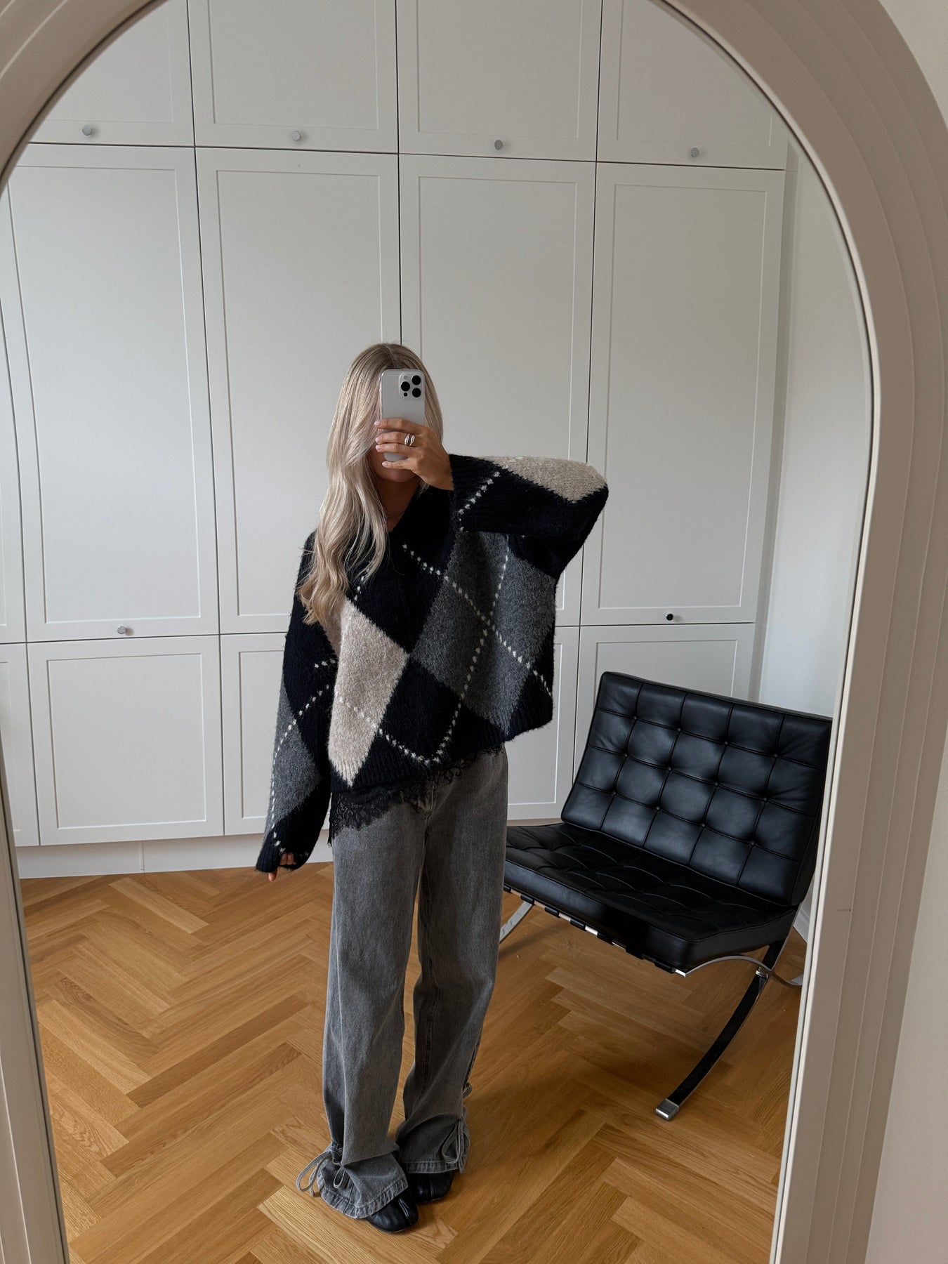Strickpullover von Noella mit großen diamantförmigen Mustern in Dunkelblau, Grau und Beige. Sie hat einen V-Ausschnitt und lange Ärmel mit einer lockeren Passform.