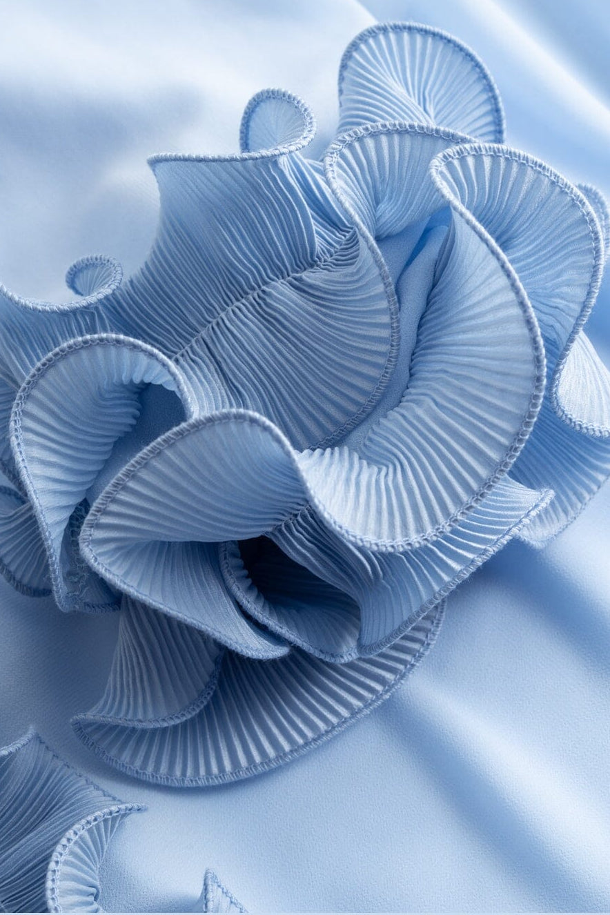 Hellblaues Kleid von Noella mit Rüschen an den Ärmeln und am Saum. Das Kleid hat einen hohen Halsausschnitt mit Bindedetail und Schleife im Nacken.