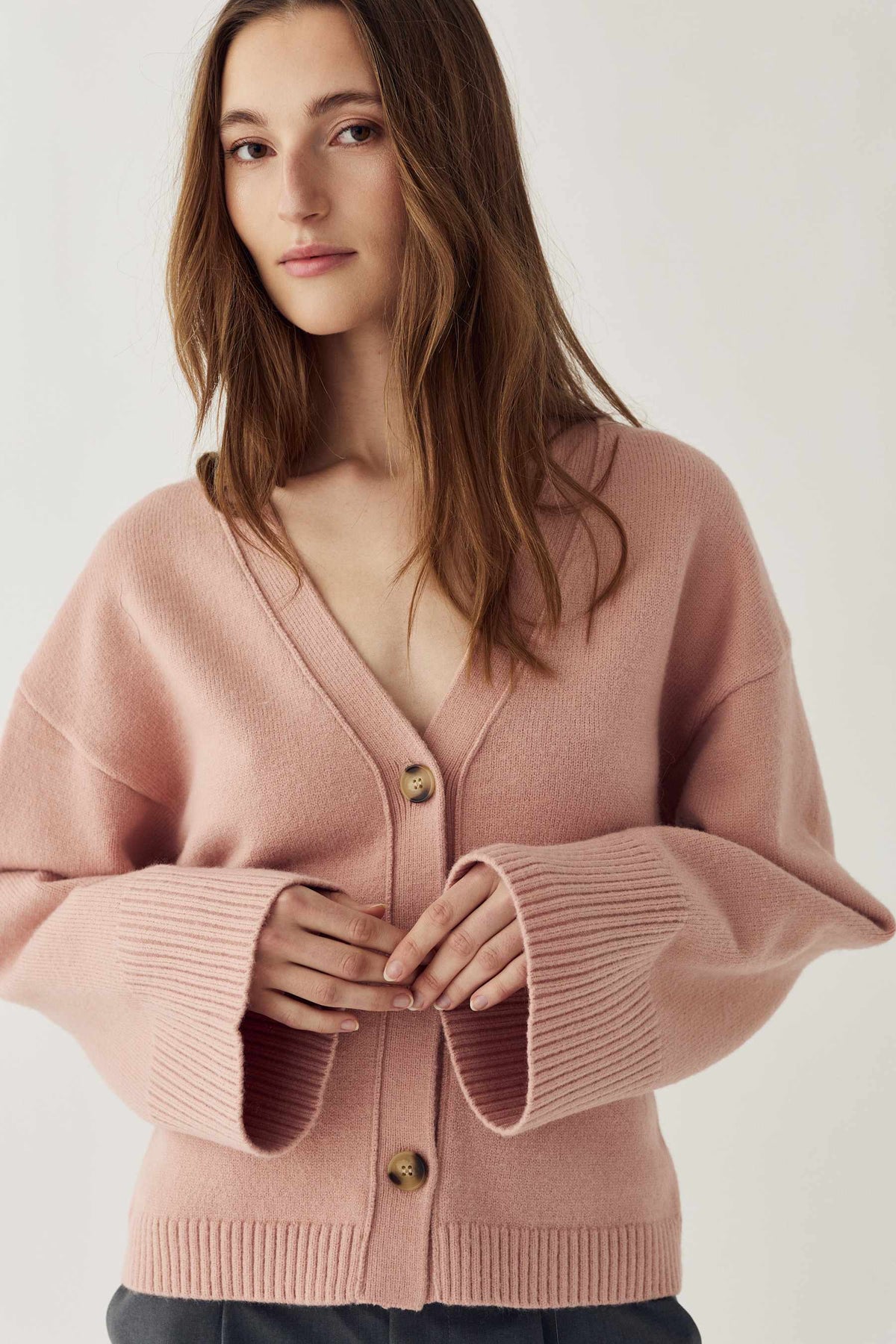 Gestrickte Strickjacke von Noella in Rosa. Sie hat einen V-Ausschnitt, eine figurbetonte Passform und voluminöse Ärmel mit gerippten Bündchen.