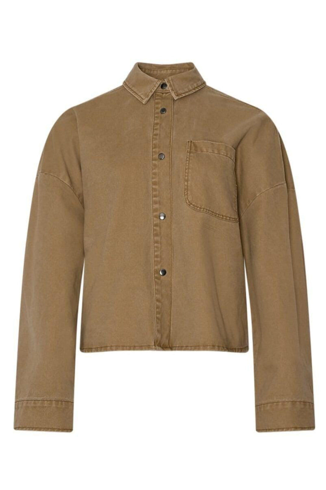 Ein Hemd von Noella in einer olivgrünen Farbe. Das Hemd besteht aus 100 % Baumwolle und hat dekorative Nähte sowie eine Knopfleiste mit metallischen Knöpfen.