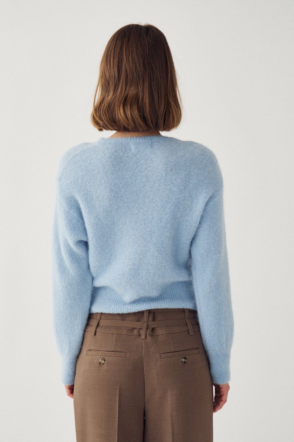Gestrickte Strickjacke von Noella in einem hellblauen Farbton. Die Strickjacke hat eine weiche Materialmischung aus Alpaka und Wolle.