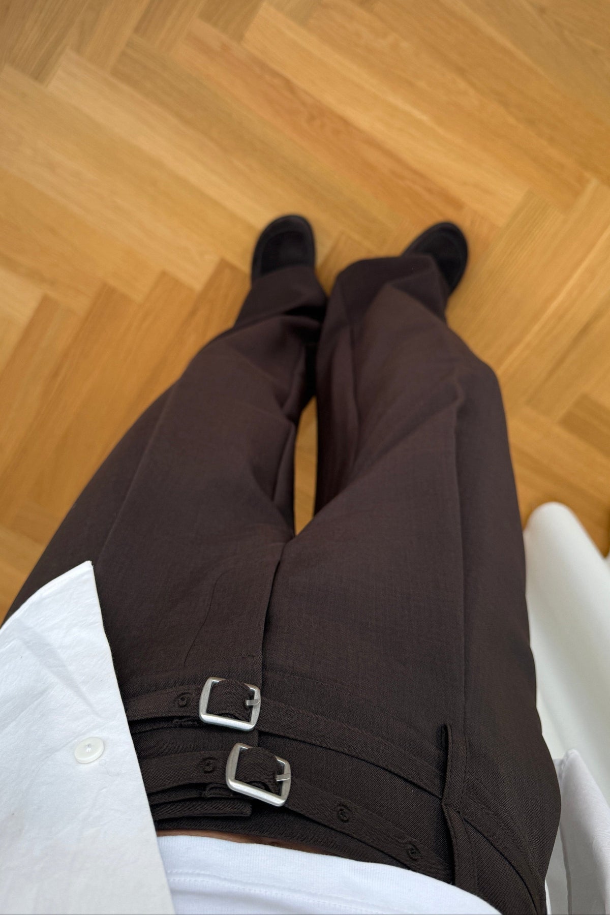 Braune Hose von Noella mit hoher Taille und weitem Bein. Die Hose hat eine lockere Passform und reicht bis zum Boden.