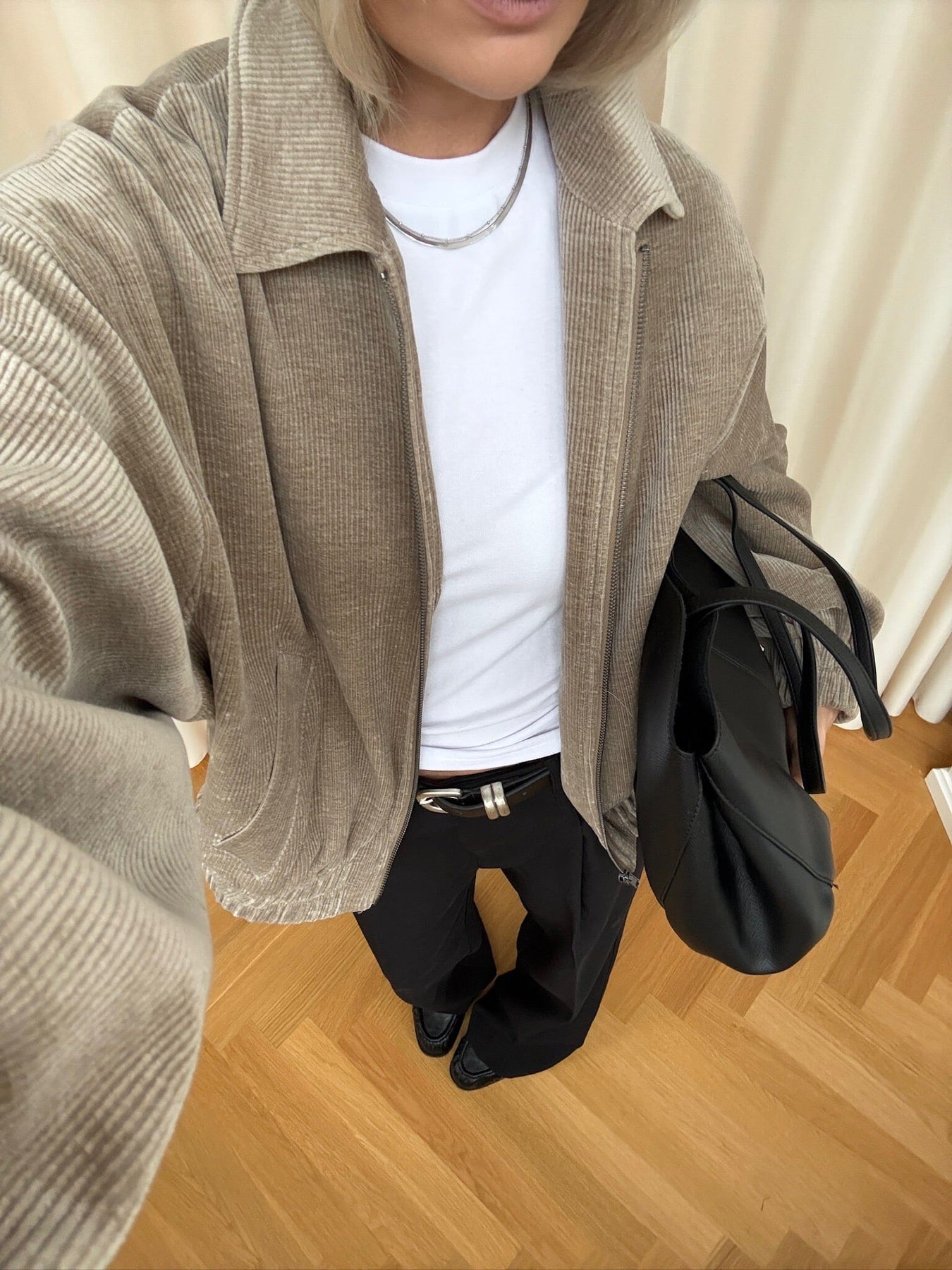 Eine Jacke von Noella in Sandfarbe mit gerippter Cordstruktur. Die Jacke hat einen klassischen Kragen und einen Reißverschluss vorne.