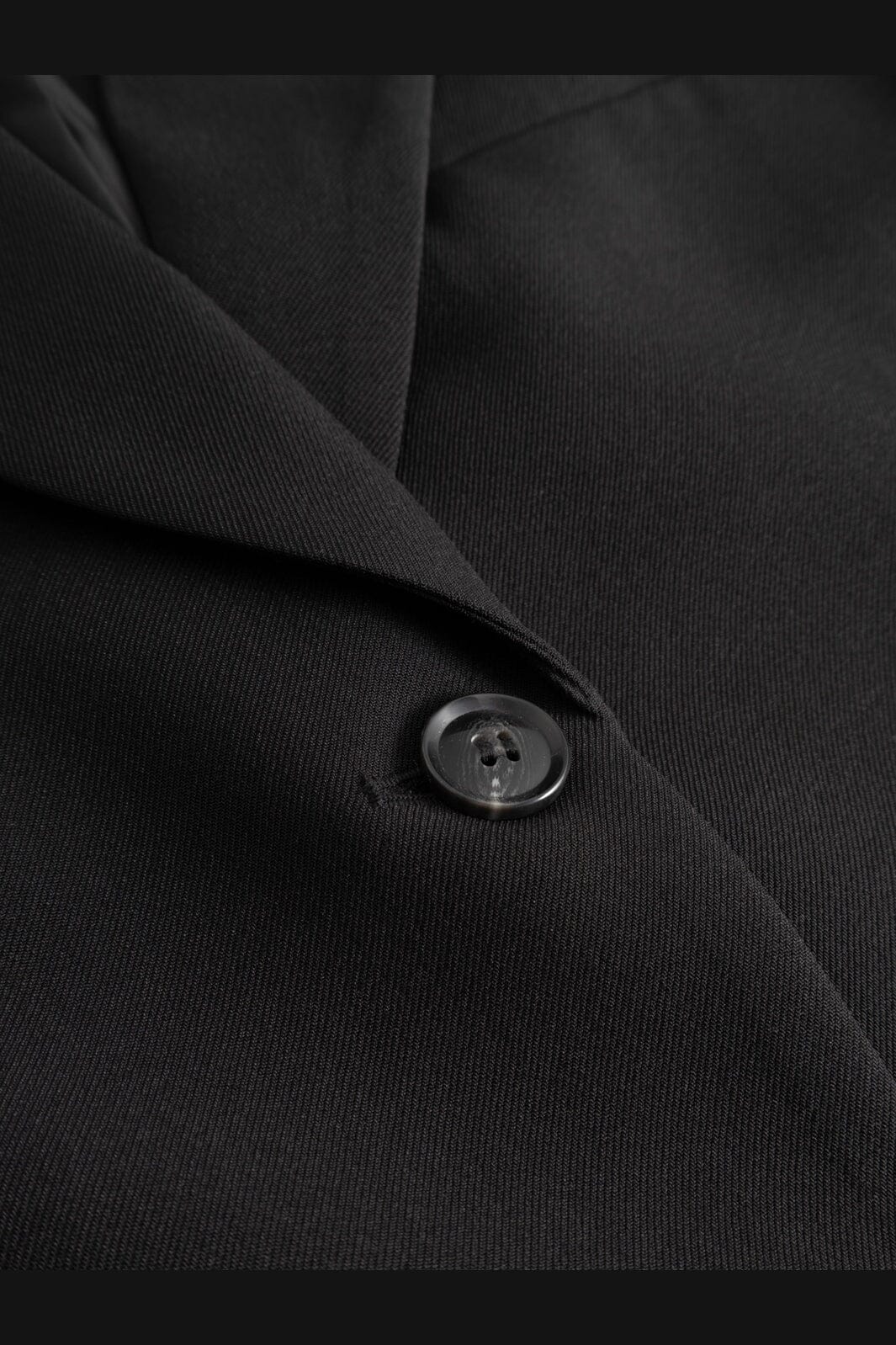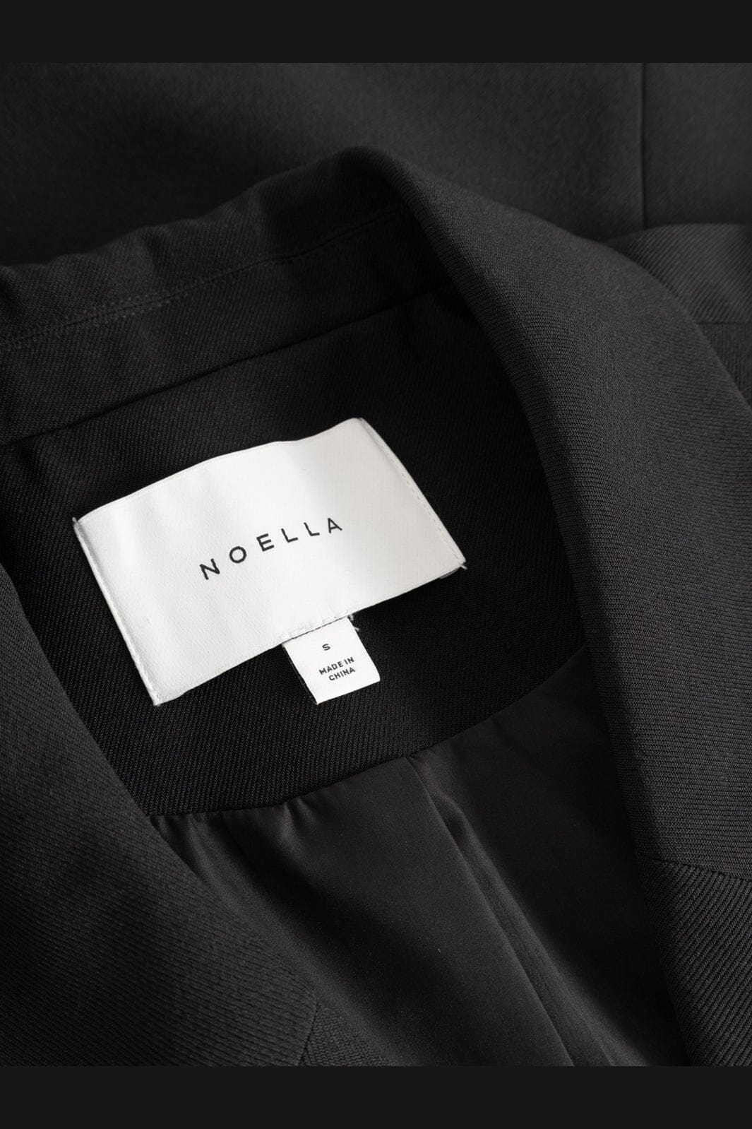 Schwarzer cropped Blazer von Noella mit Hemdkragen und Knopfverschluss. Der Blazer hat kurze Ärmel und eine oversized Passform.