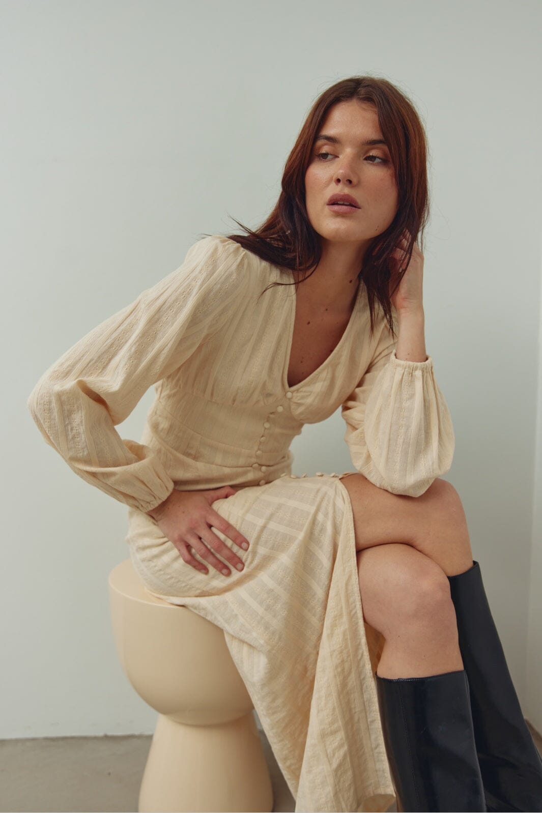 Langes Kleid von Noella aus cremeweißer Baumwolle mit V-Ausschnitt, langen Ärmeln und Knopfleiste in der Mitte. Es eignet sich sowohl für den Alltag als auch für festliche Anlässe.