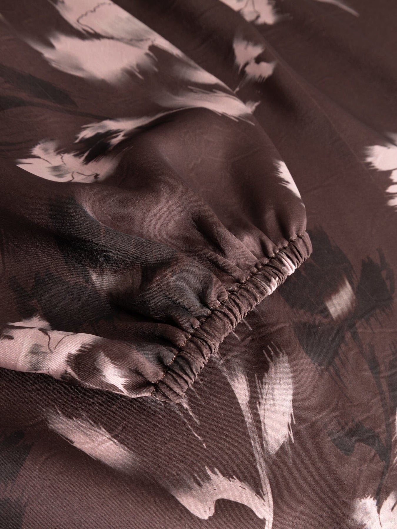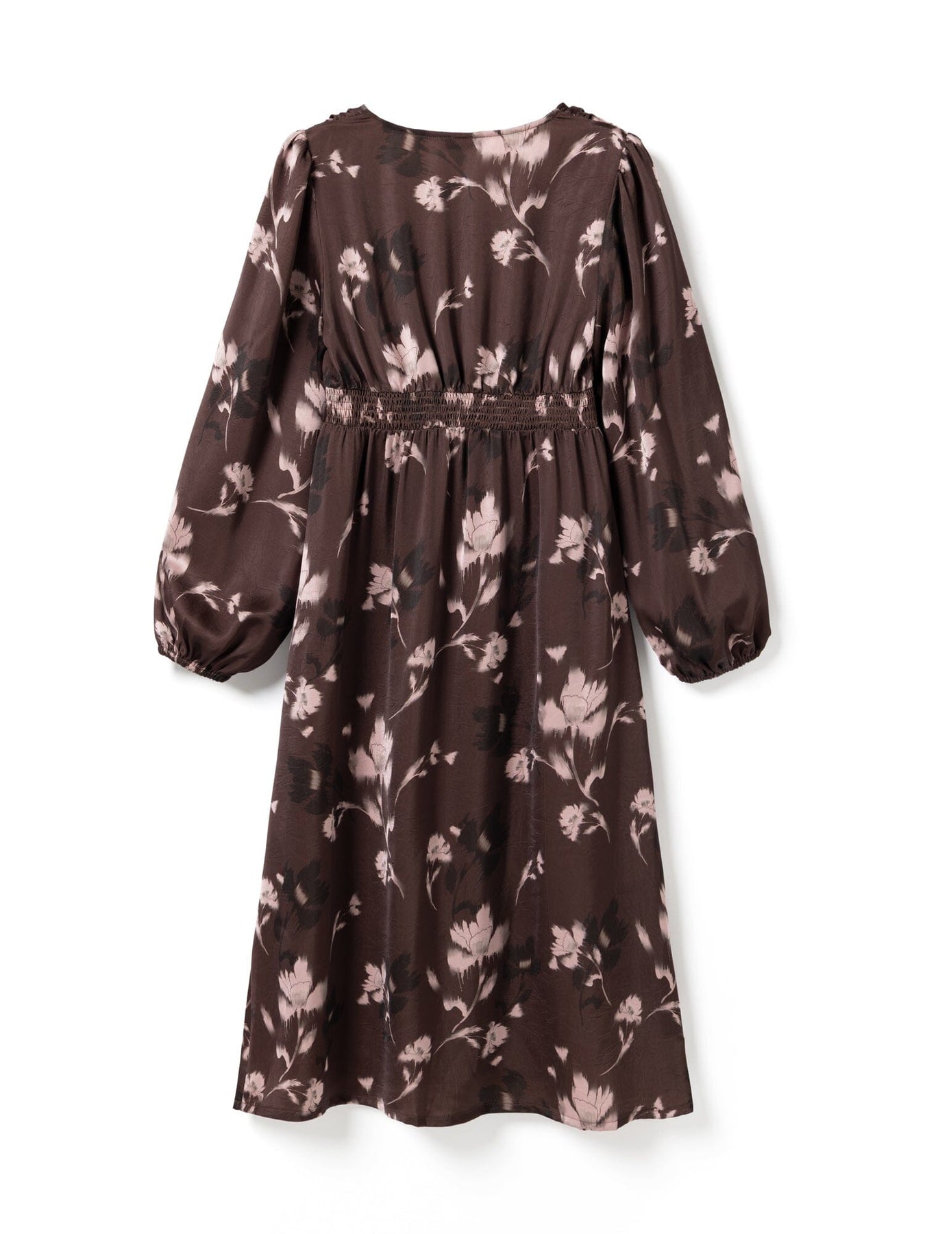 Ein Kleid von Noella in Burgunder-Tönen mit einem Blumenmuster in roten und braunen Nuancen. Das Kleid hat lange Ärmel, einen V-Ausschnitt mit Knopfdetails und eine betonte Taille.