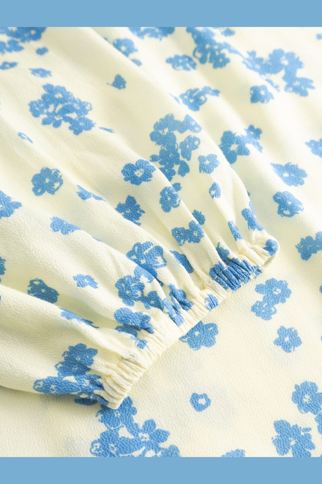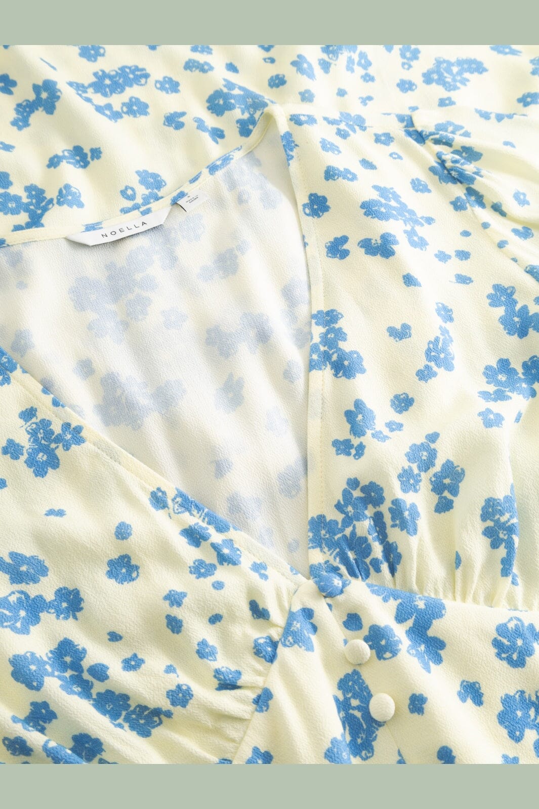 Maxikleid von Noella in Gelb mit blauem Blumenprint. Das Kleid hat einen tiefen V-Ausschnitt, lange Ärmel und reicht bis zu den Knöcheln.