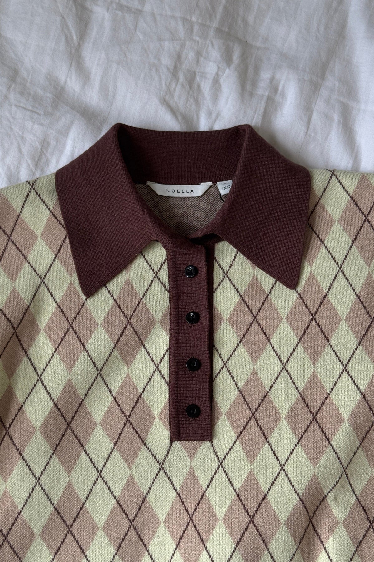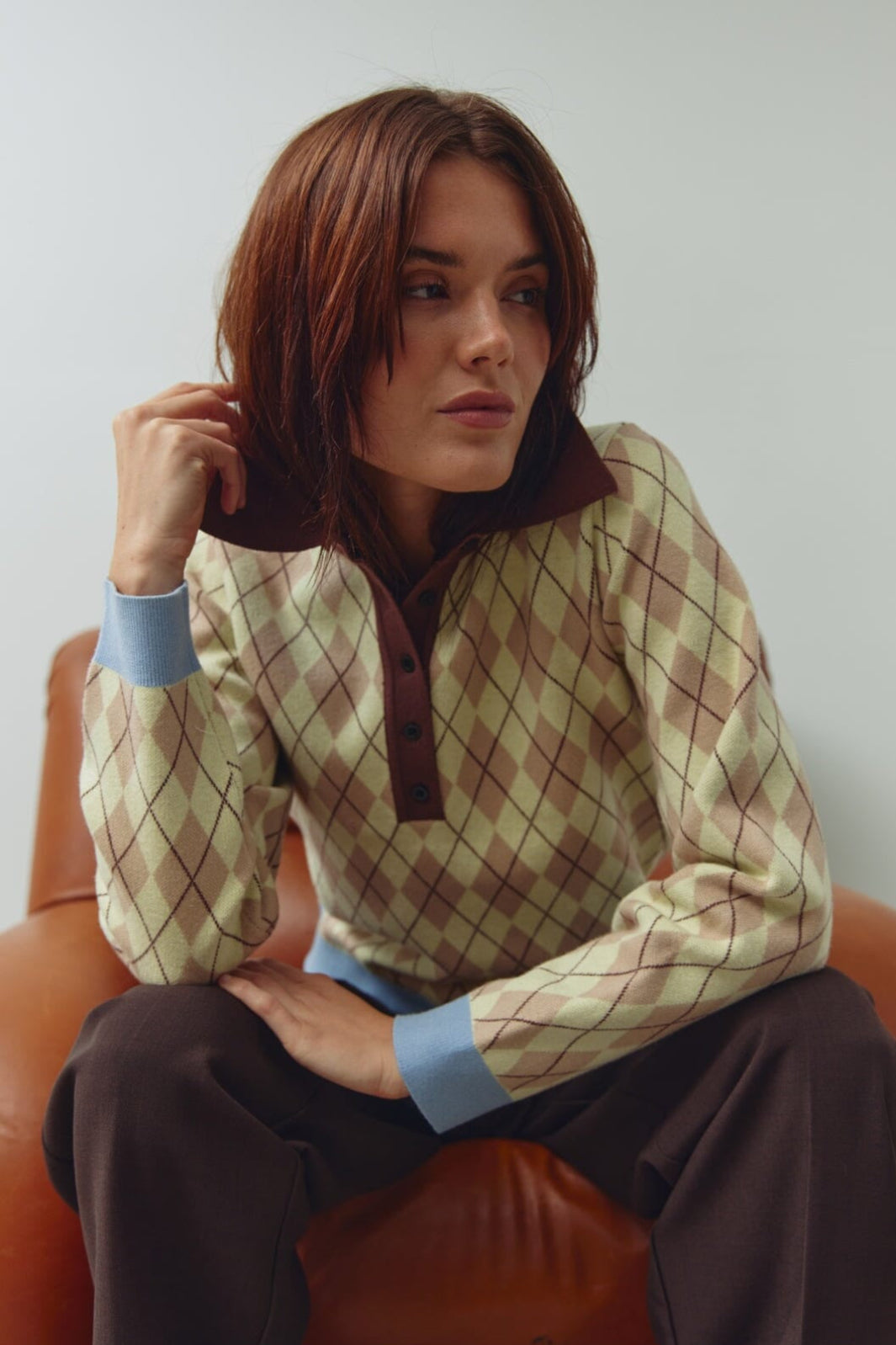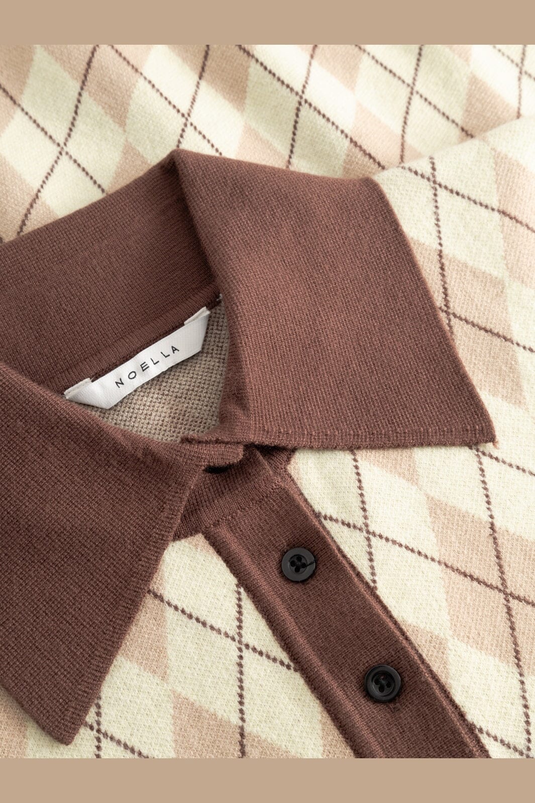 Strickpullover von Noella aus gelb-braun kariertem Intarsienstrick. Der Pullover hat einen braunen Polokragen, lange Ärmel mit hellblauen Bündchen und eine Slim-Fit-Passform.