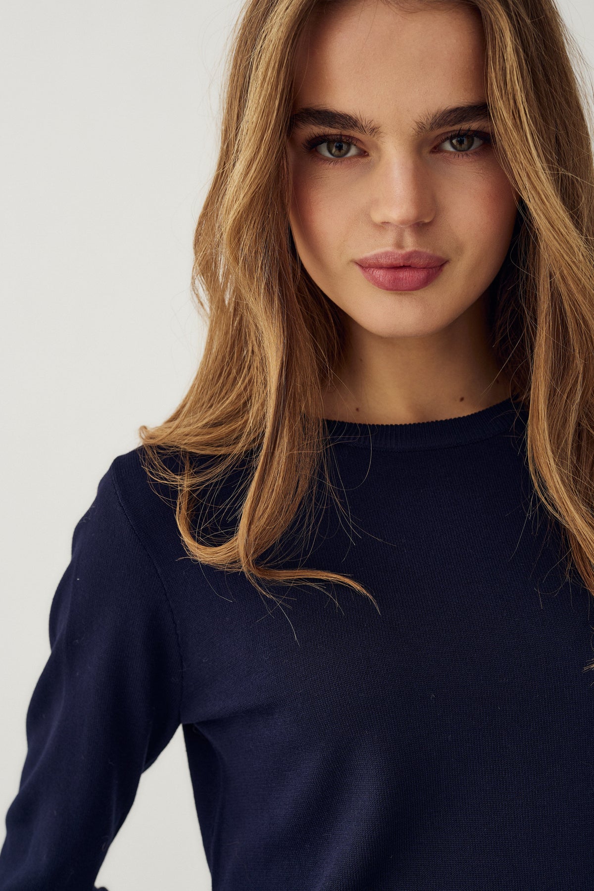 Dunkelblauer Strickpullover von Noella aus 100 % Viskose. Der Pullover hat einen Rundhalsausschnitt und lange Ärmel mit geripptem Abschluss.