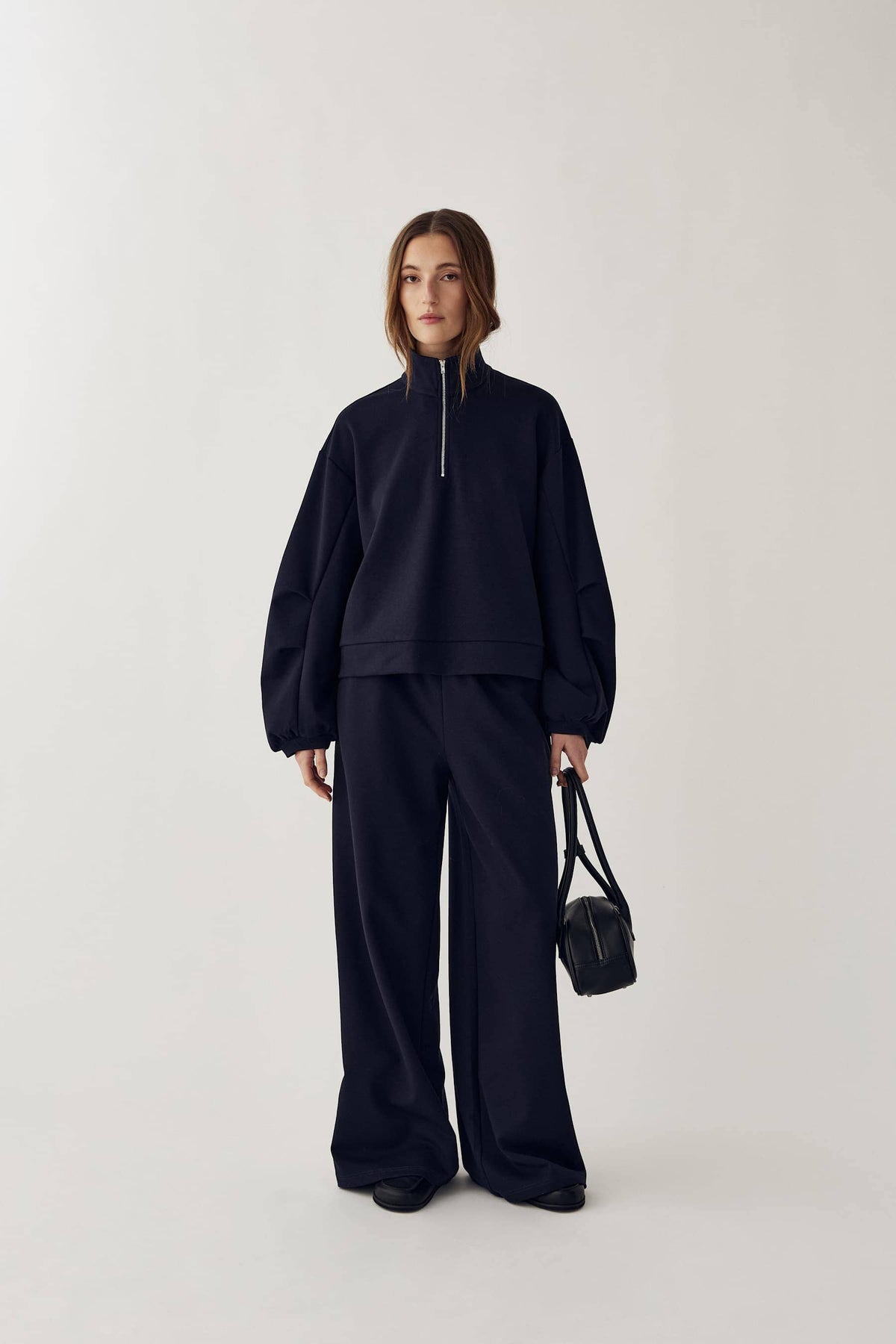 Dunkelblaue Top von Noella, gefertigt aus 100 % Polyester. Das Top hat einen hohen Kragen mit halbem Reißverschluss und lange Ärmel mit elastischen Bündchen.