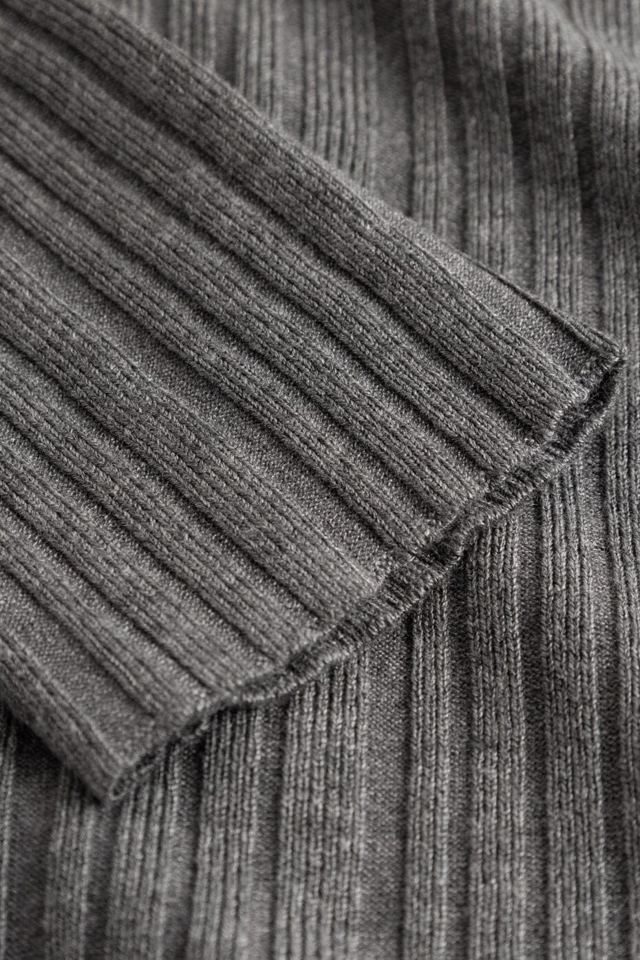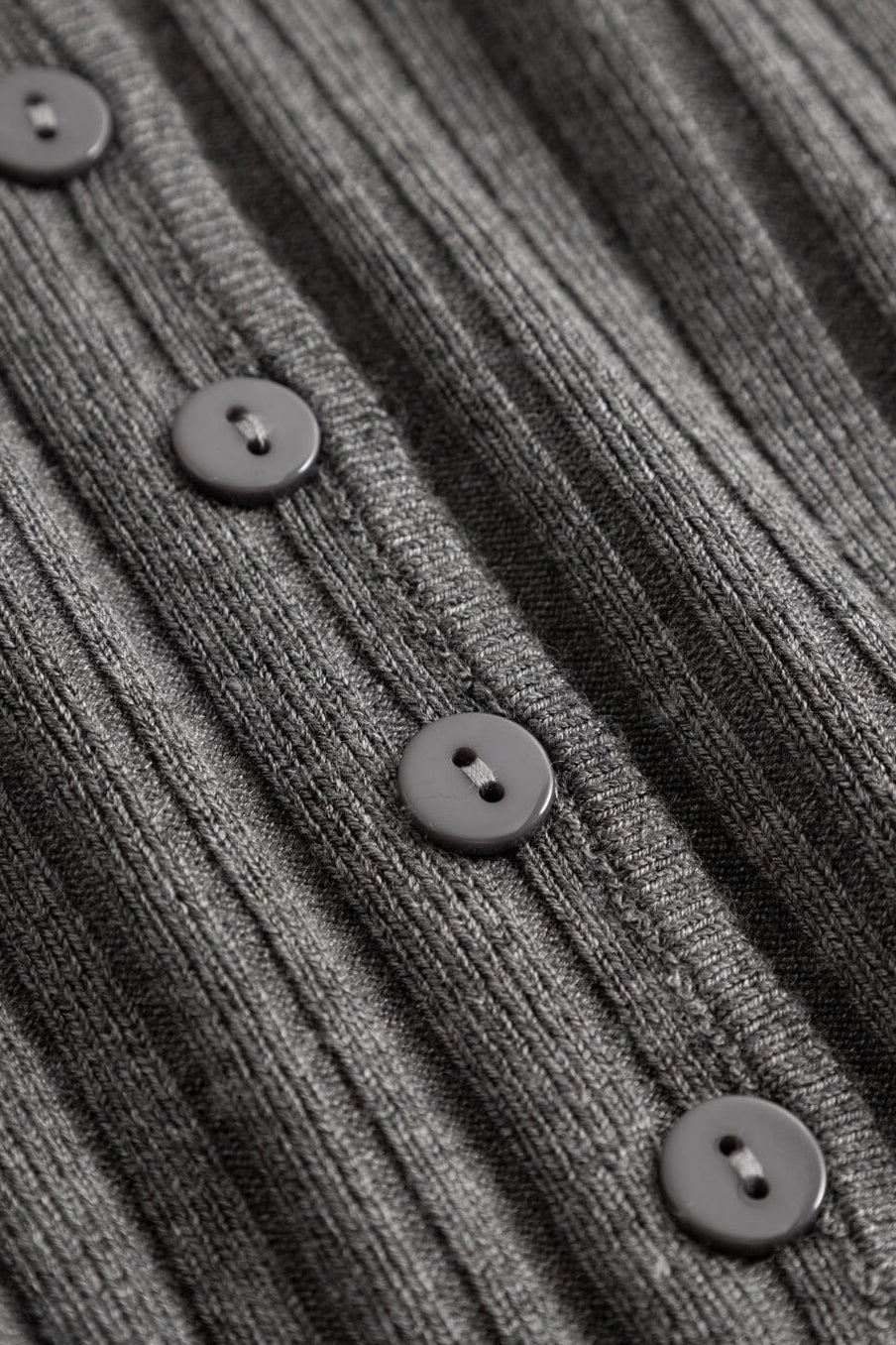Graumeliertes Top von Noella aus gerippter Viskose. Das Top hat einen tiefen V-Ausschnitt mit Knopfleiste vorn und langen Ärmeln.