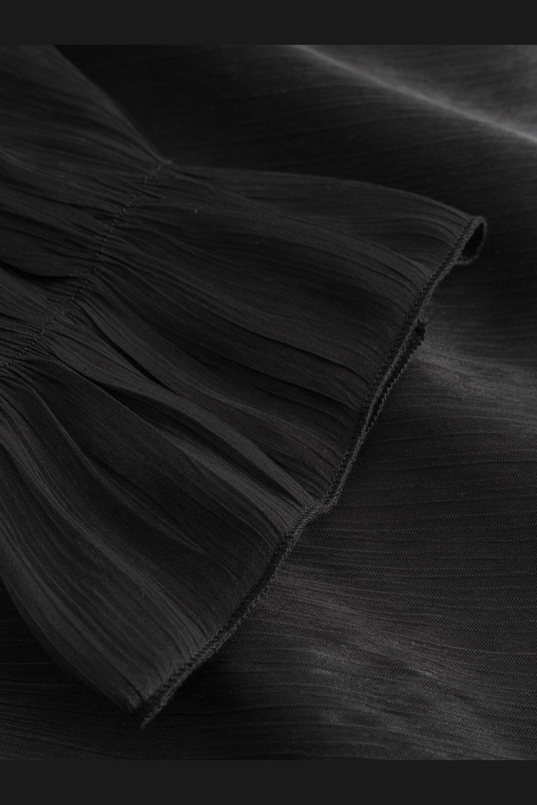 Schwarze Bluse von Noella mit Off-Shoulder-Design und dünnen Trägern. Die Bluse hat lange Ärmel mit elastischen Bündchen und eine große Rüsche an der Brust.