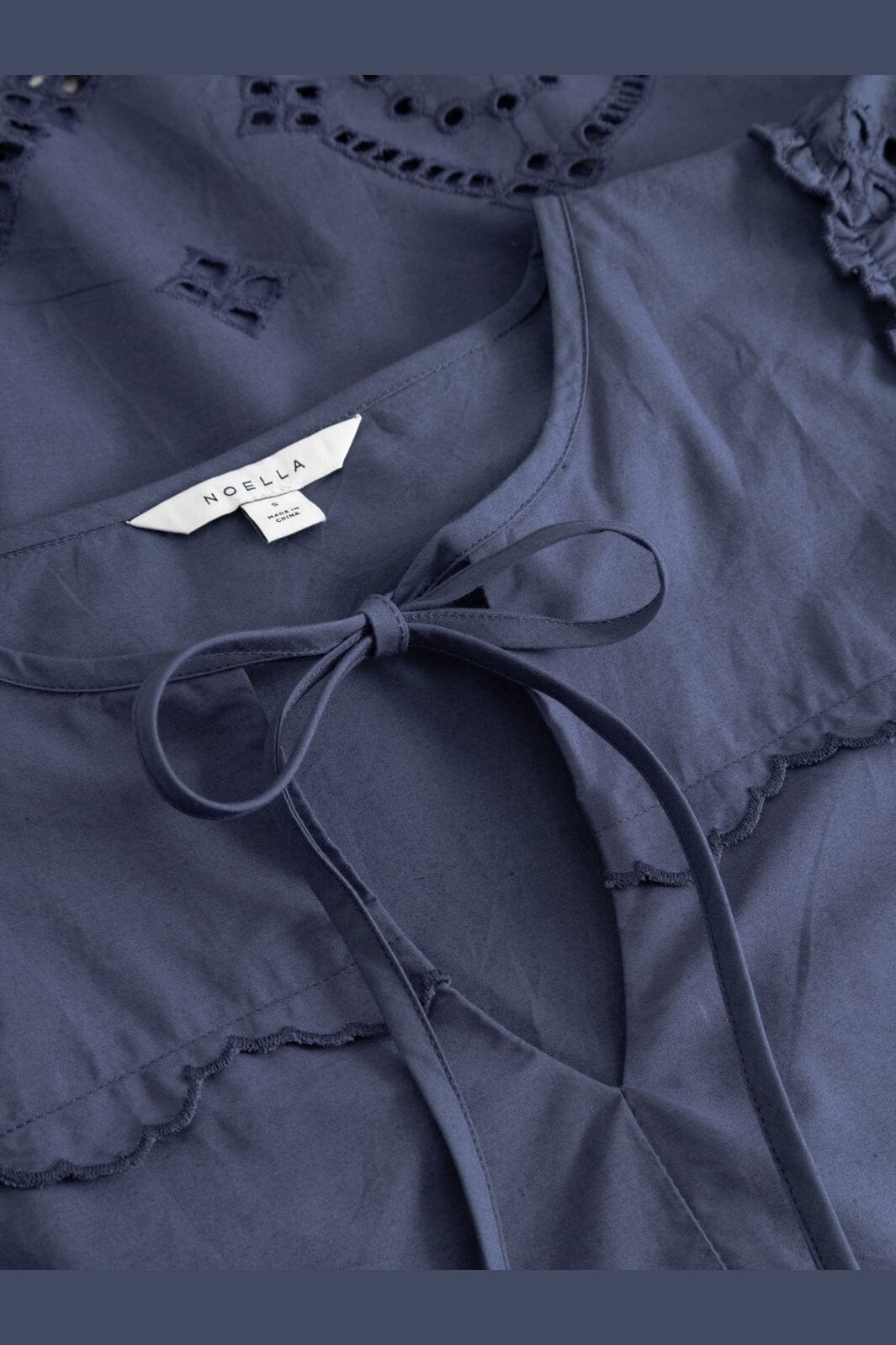 Kleid von Noella in Staubblau. Hergestellt aus 100 % Baumwolle mit Stickereidetails, Bindeband und Spitze.