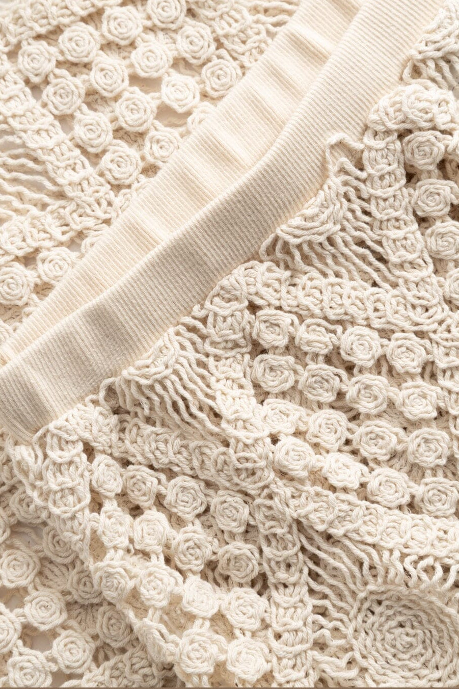 Gehäkelter Rock von Noella in einem Off-White-Ton. Der Rock besteht aus 98 % Baumwolle und 2 % Nylon und hat ein gehäkeltes Design mit langen Makramee-Fransen.