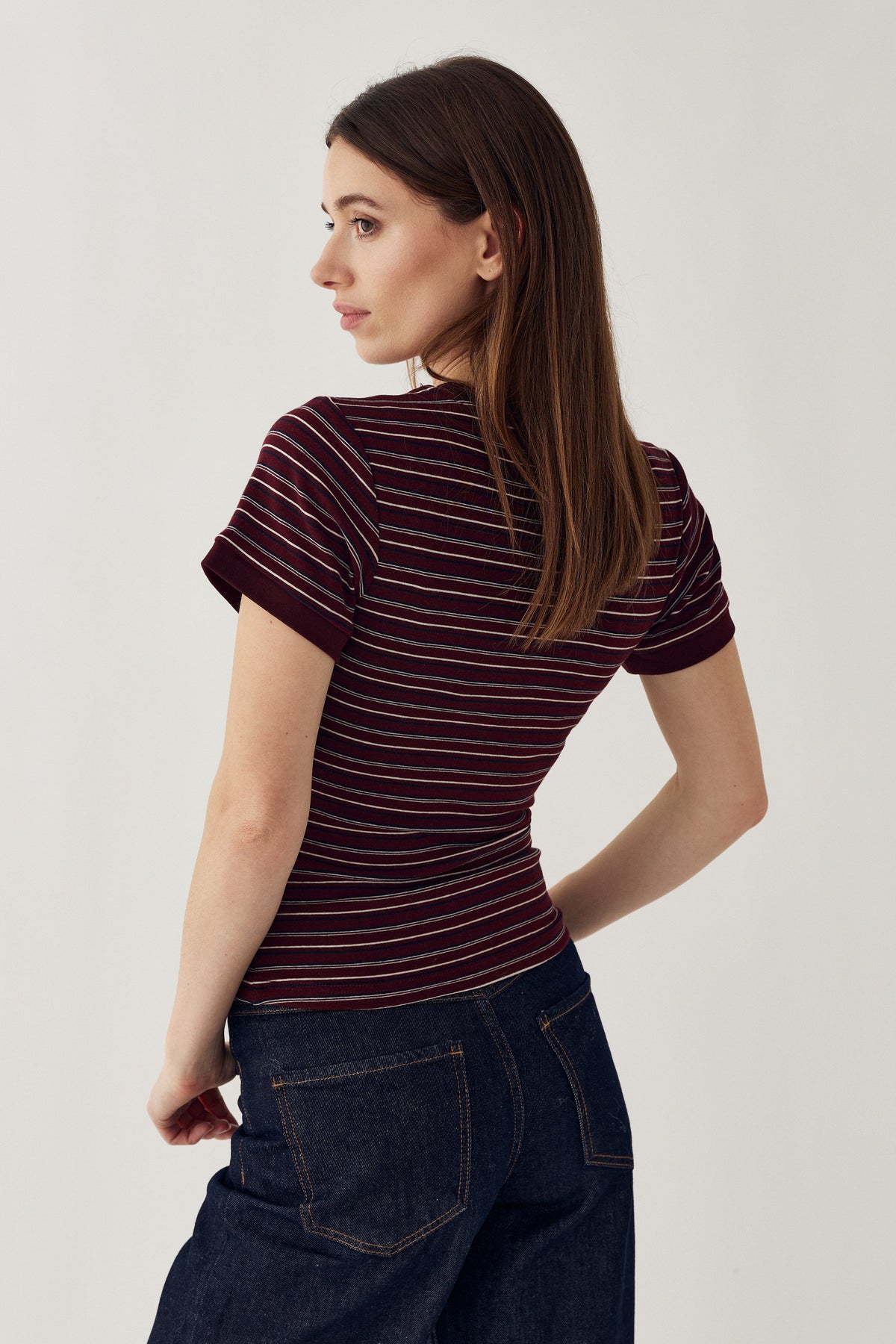 Gestreiftes Top von Noella in Bordeaux mit waagerechten Streifen in Weiß und Dunkelblau. Das Top hat kurze Ärmel und einen runden Halsausschnitt.