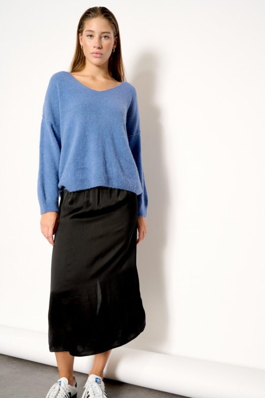 Schwarzer Midi-Rock von Noella mit elastischem Bund. Der Rock reicht bis zur Mitte der Wade und hat eine gerade Passform, die locker am Körper fällt.