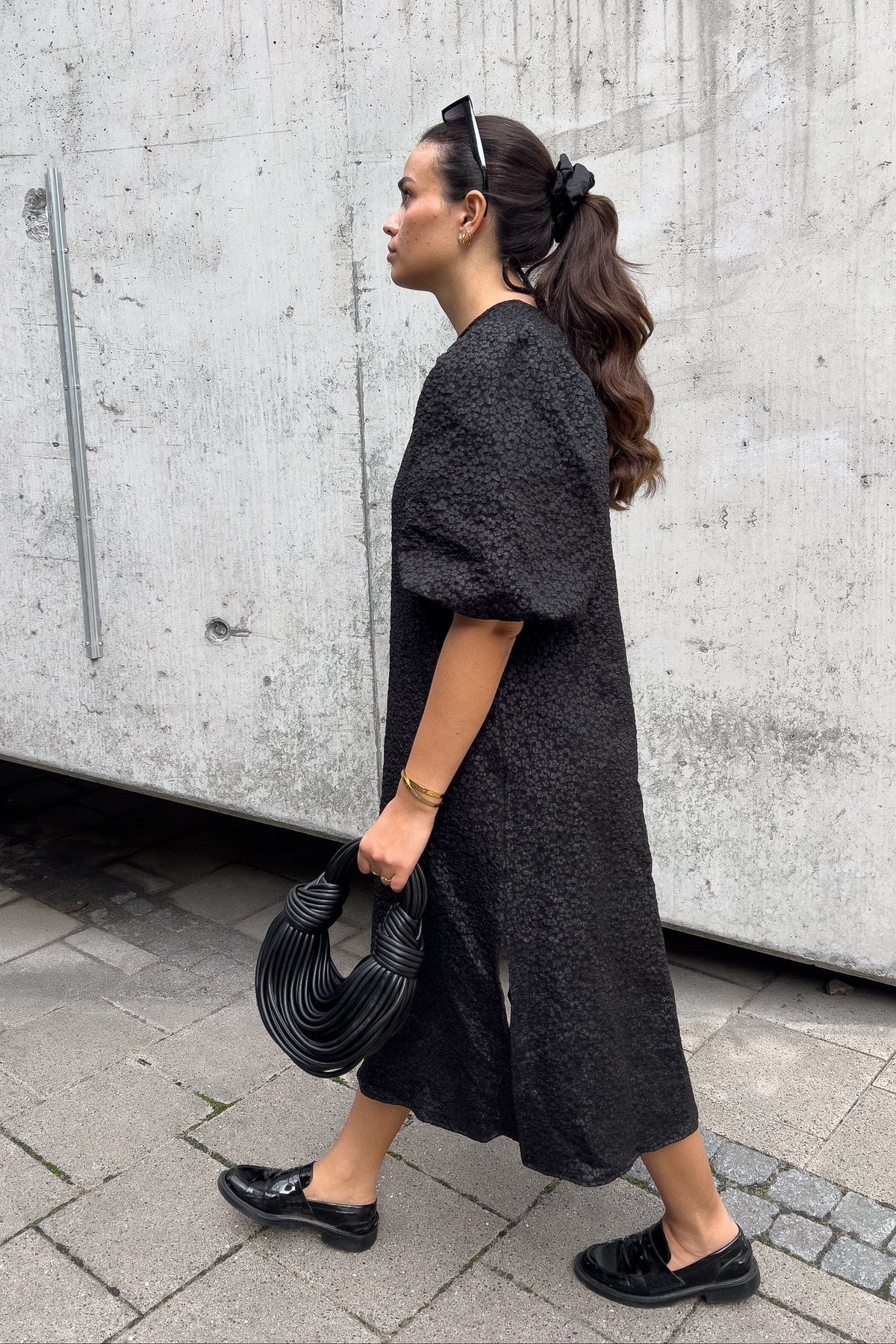 Schwarzes langes Kleid von Noella mit blumenmuster Textur. Das Kleid hat Puffärmel und Schnürdetails im Rücken sowie einen V-Ausschnitt und einen schönen Fall bis zur Mitte der Wade.