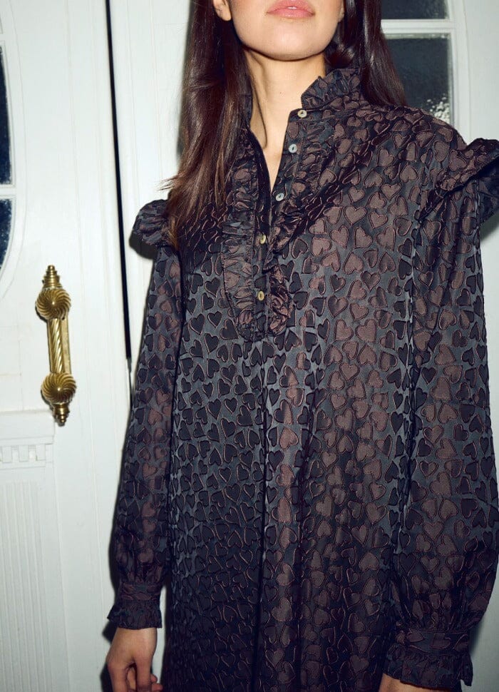 Schwarzes Kleid mit Rüschendetails an den Schultern und am Saum. Der Stoff hat ein eingewebtes Herzmuster, und das Kleid wird vorne mit Knöpfen geschlossen. Der hohe Kragen und der Regular Fit machen es vielseitig einsetzbar.
