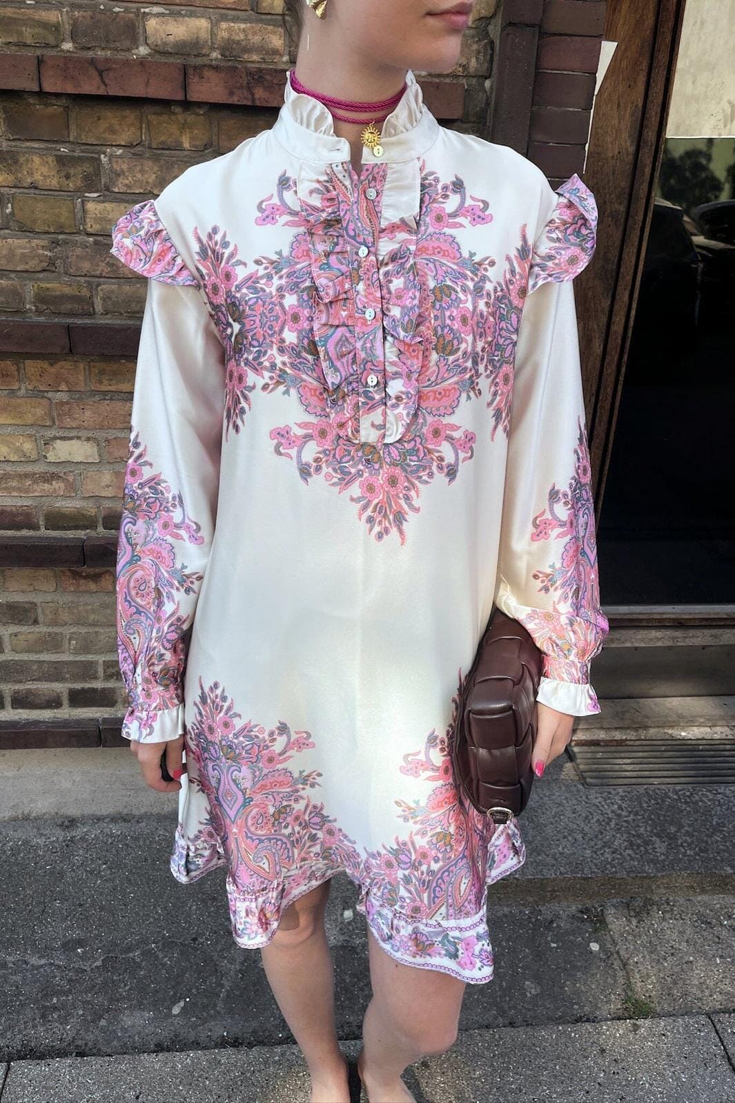 Kurz Kleid von Noella mit Blumenmuster in hellen und dunklen Nuancen. Das Kleid hat einen hohen Kragen mit Rüschen, lange Ärmel und Knöpfe vorne. Das Muster kombiniert Pink und Blau auf hellem Hintergrund.