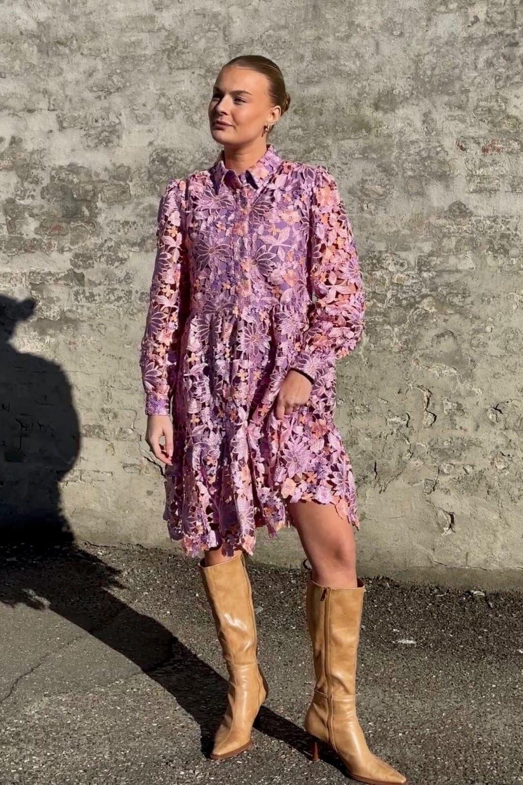 Spitzenkleid von Noella in lila Mix mit orange und pinkem Blumenmuster. Das Kleid besteht aus schwerer Spitze mit Rüschendetails und hat einen Hemdkragen sowie lange Ärmel.