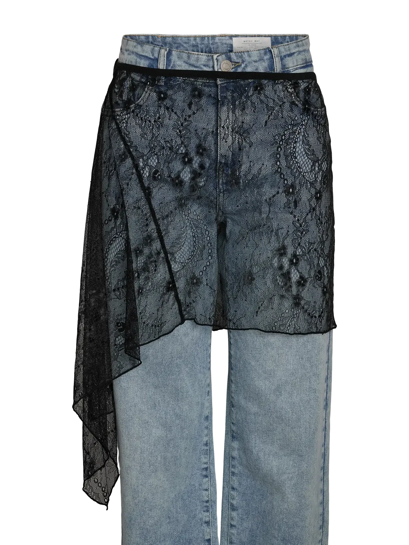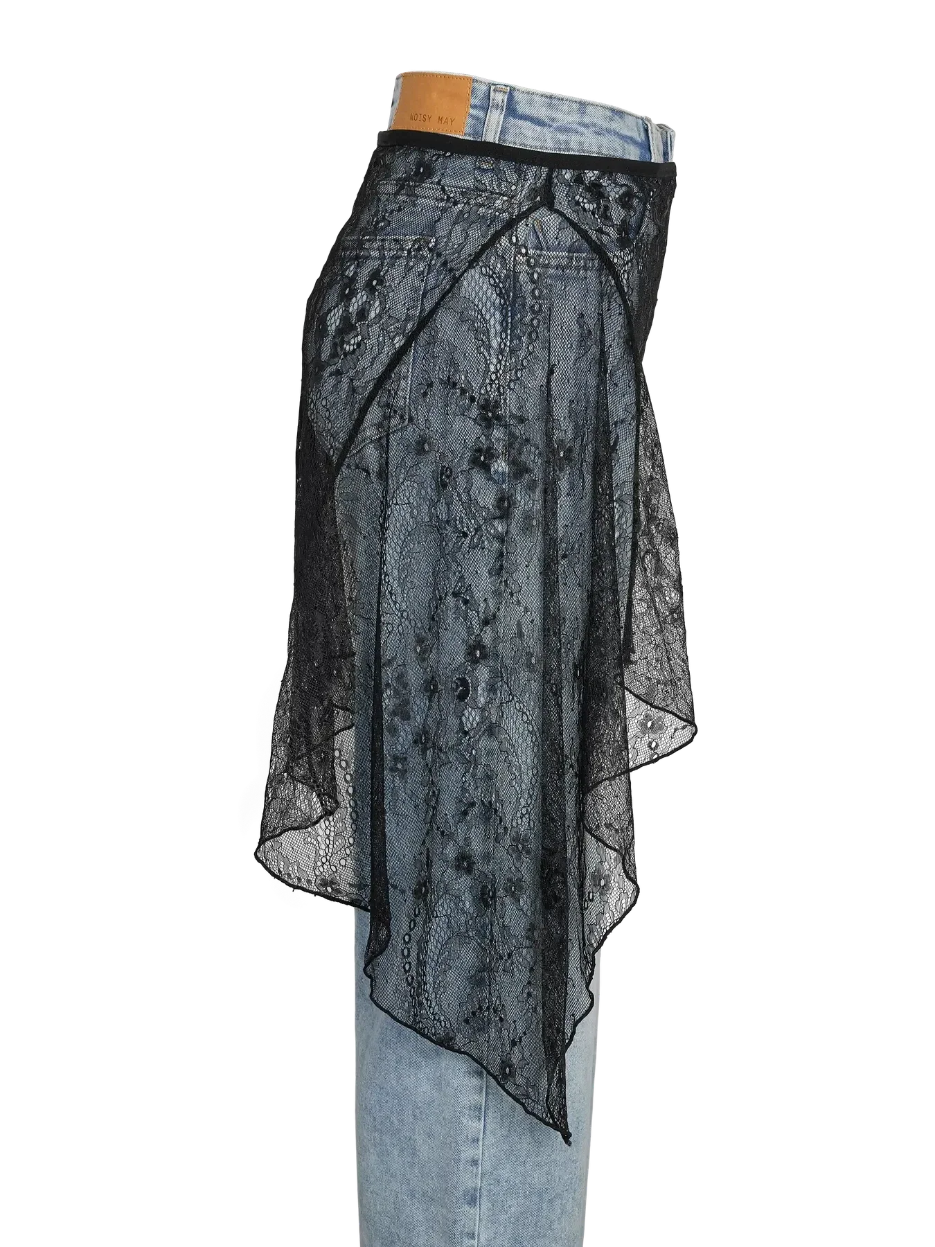 Schwarzer Spitzenrock von Noisy May, entworfen, um über Jeans oder Hosen getragen zu werden. Der Rock hat ein florales Spitzenmuster und einen asymmetrischen Saum.
