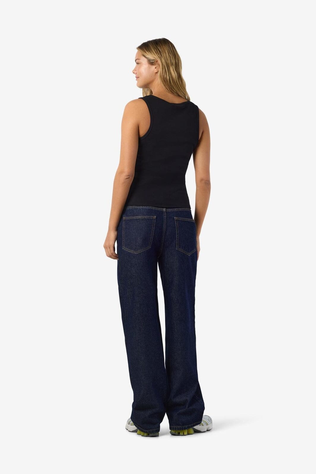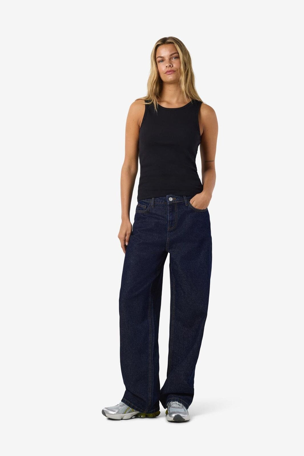 Schwarzes Tanktop von Noisy May mit Rundhalsausschnitt und breiten Trägern. Die figurbetonte Passform betont die Linien des Körpers.