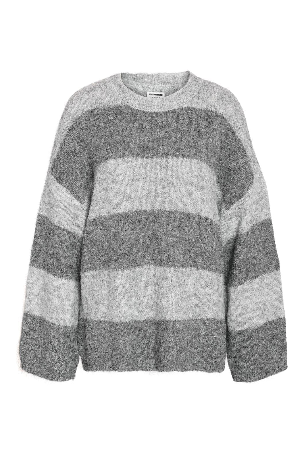 Gestreifte Strickjacke von Noisy May in Grautönen. Der Strick hat eine Oversize-Passform mit langen Ärmeln und Rundhalsausschnitt. Das weiche Strickmaterial hat breite horizontale Streifen in hellen und mittelgrauen Tönen.