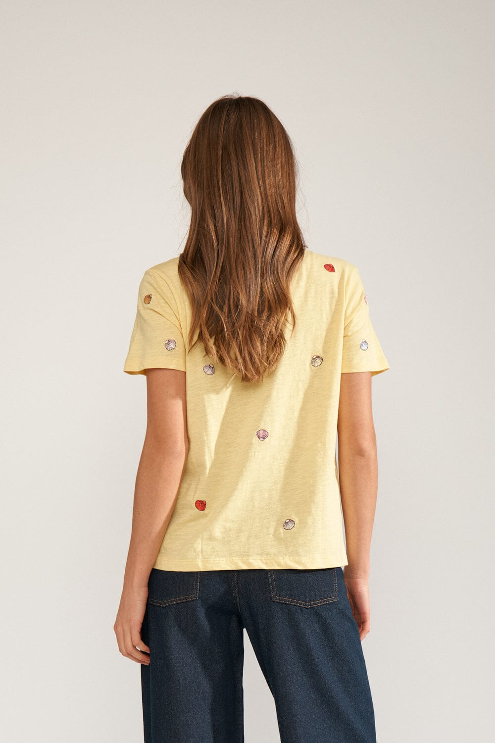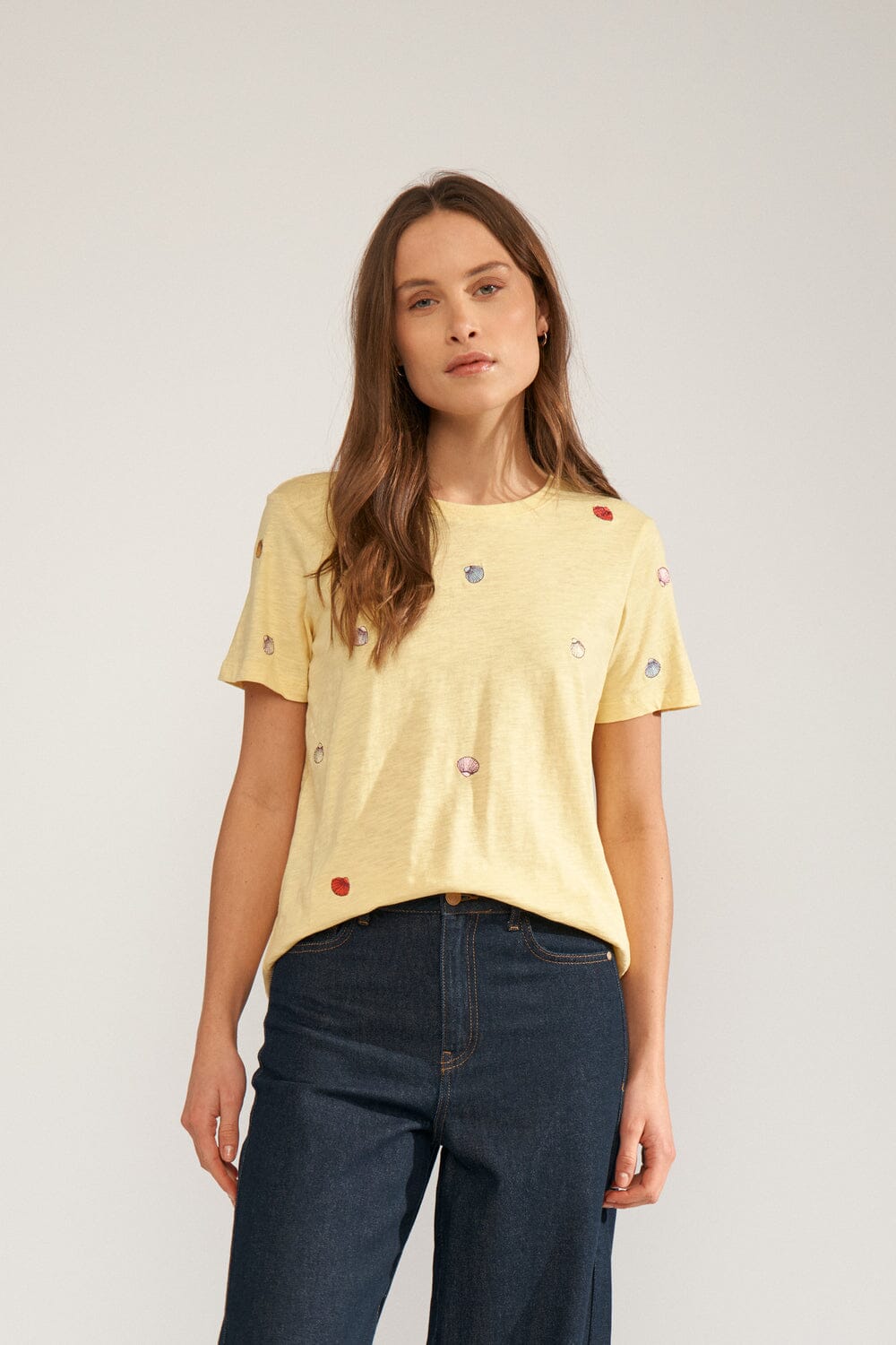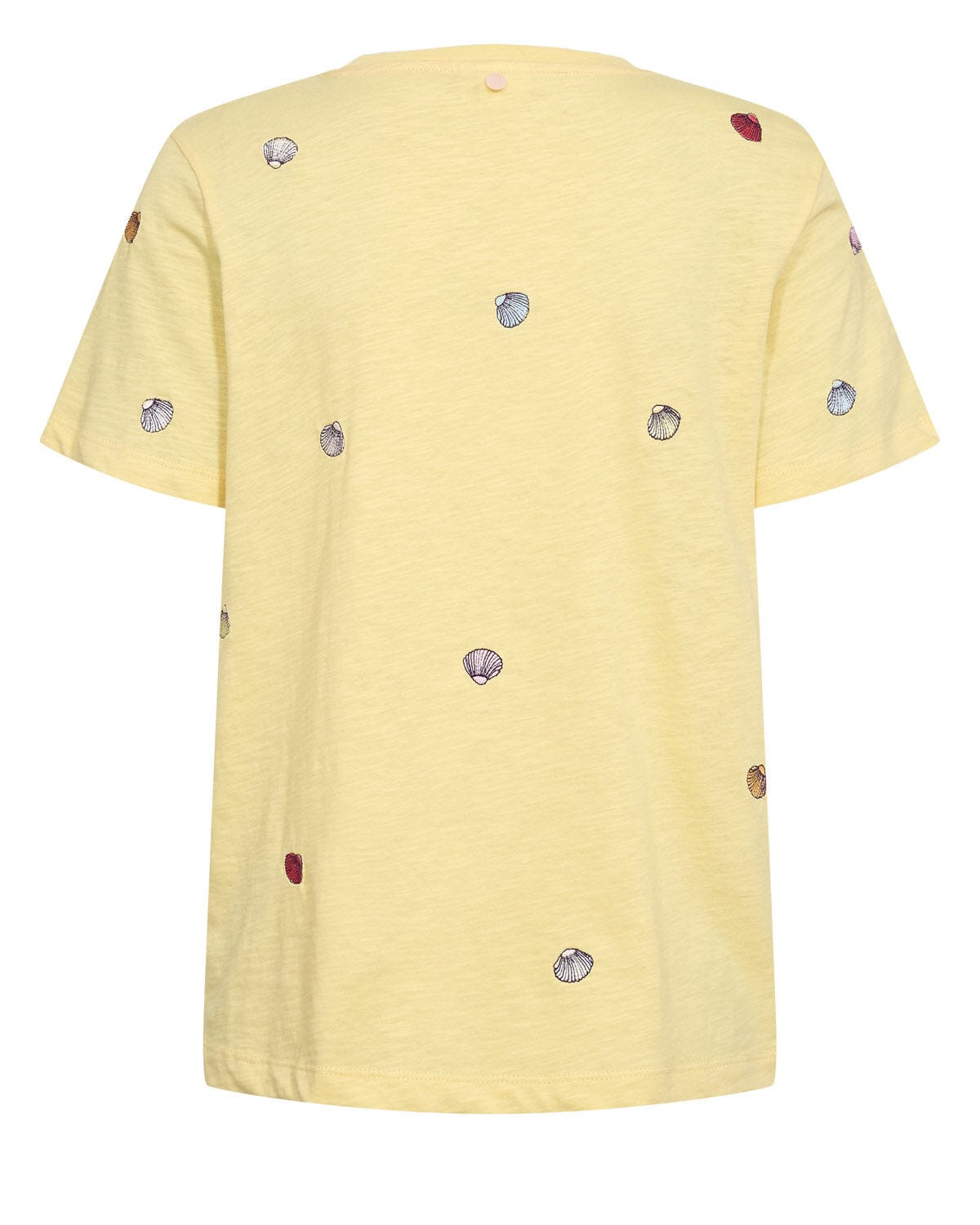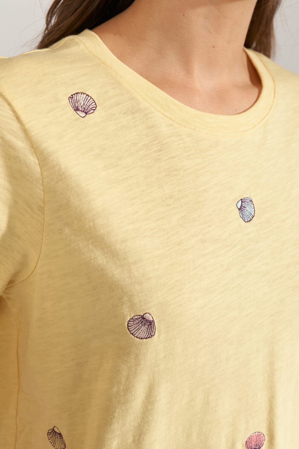 Gelbes T-Shirt von Nümph aus 100 % Bio-Baumwolle. Das T-Shirt ist mit kleinen gestickten Muschelmuster über den Stoff verteilt.
