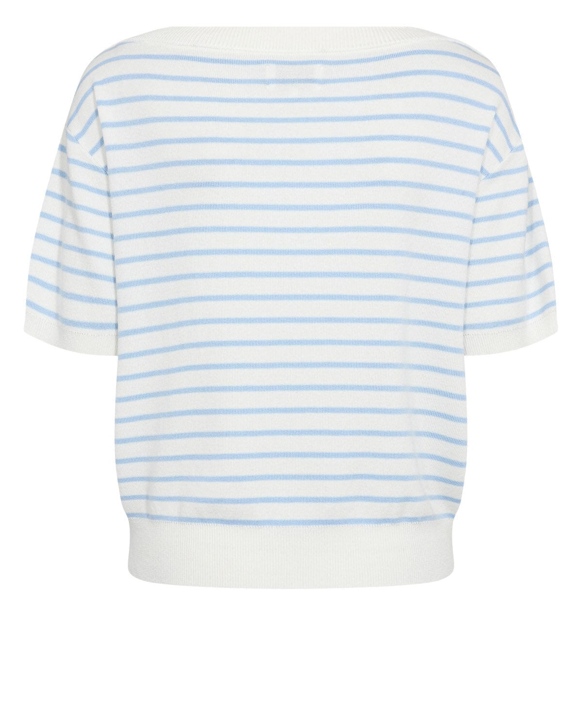 Kurzärmeliger Pullover von Nümph mit waagerechten hellblauen Streifen auf weißem Hintergrund. Der Pullover hat gerippte Abschlüsse am Halsausschnitt und an den Ärmeln.