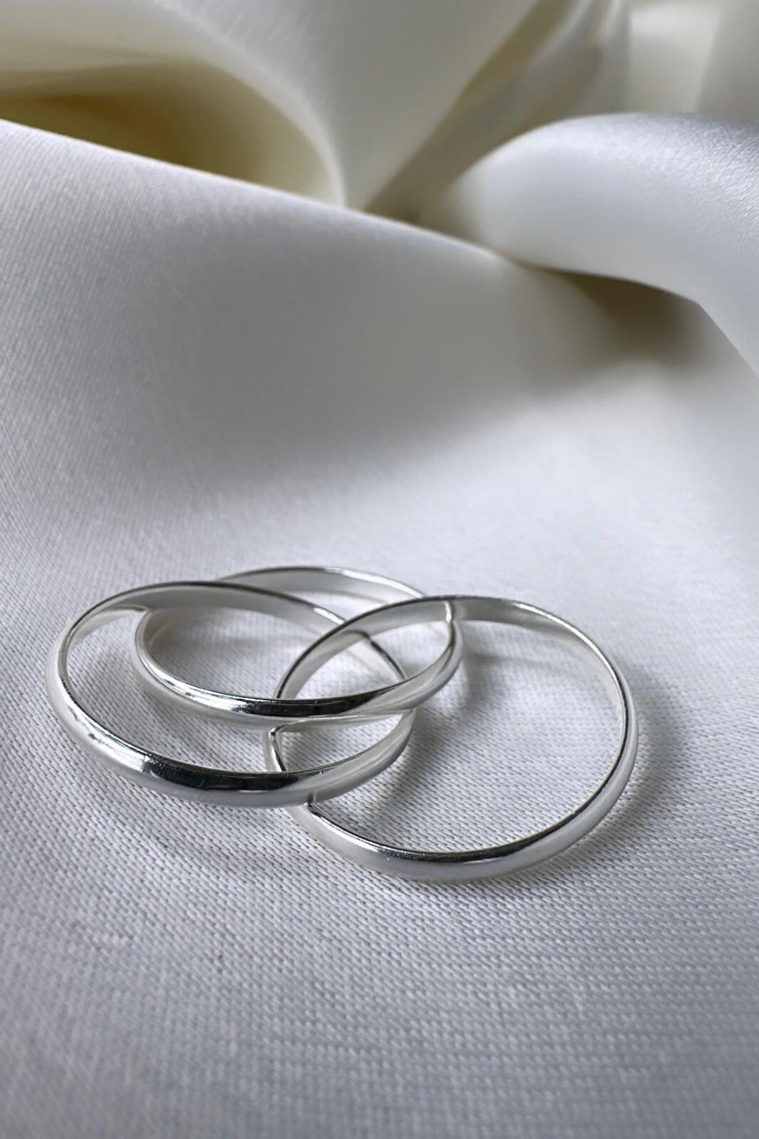 Versilberter Ring von O element mit drei verbundenen Ringen. Der Ring ist aus Messing mit einer glänzenden Silberoberfläche gefertigt, die ein sauberes und minimalistisches Design schafft.