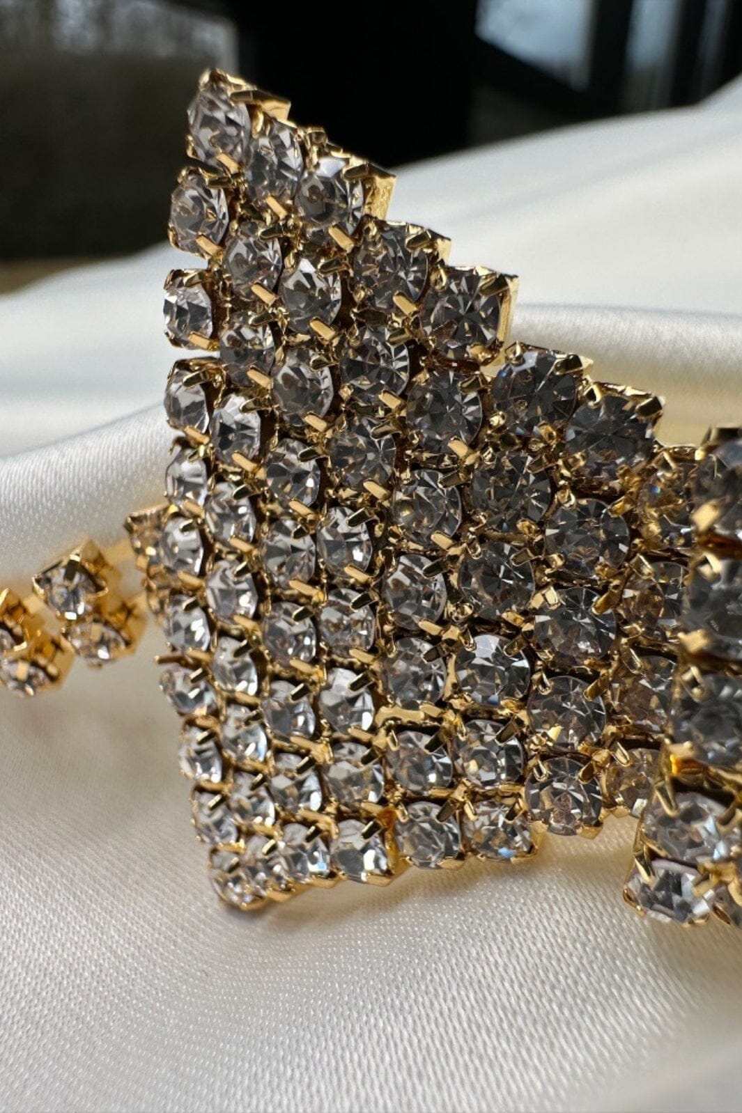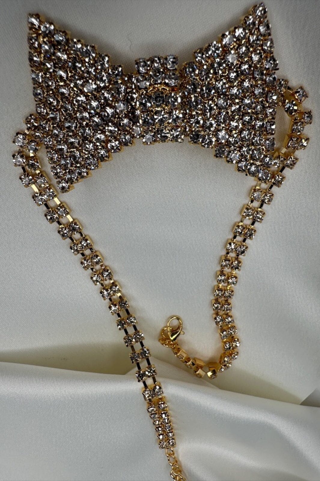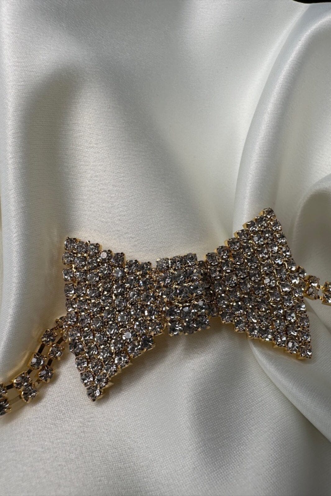 Vergoldete Halskette von O element mit einer Schleife in Schmetterlingsform. Die Schleife ist mit kleinen glitzernden Steinen besetzt und hat ein goldenes Finish, das einen feinen Ausdruck schafft.