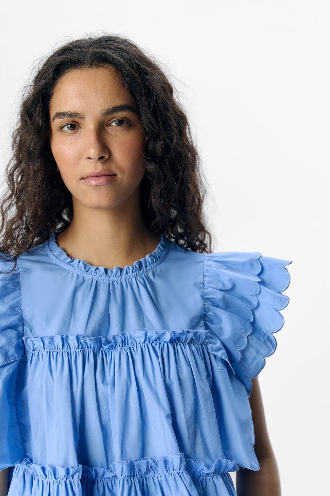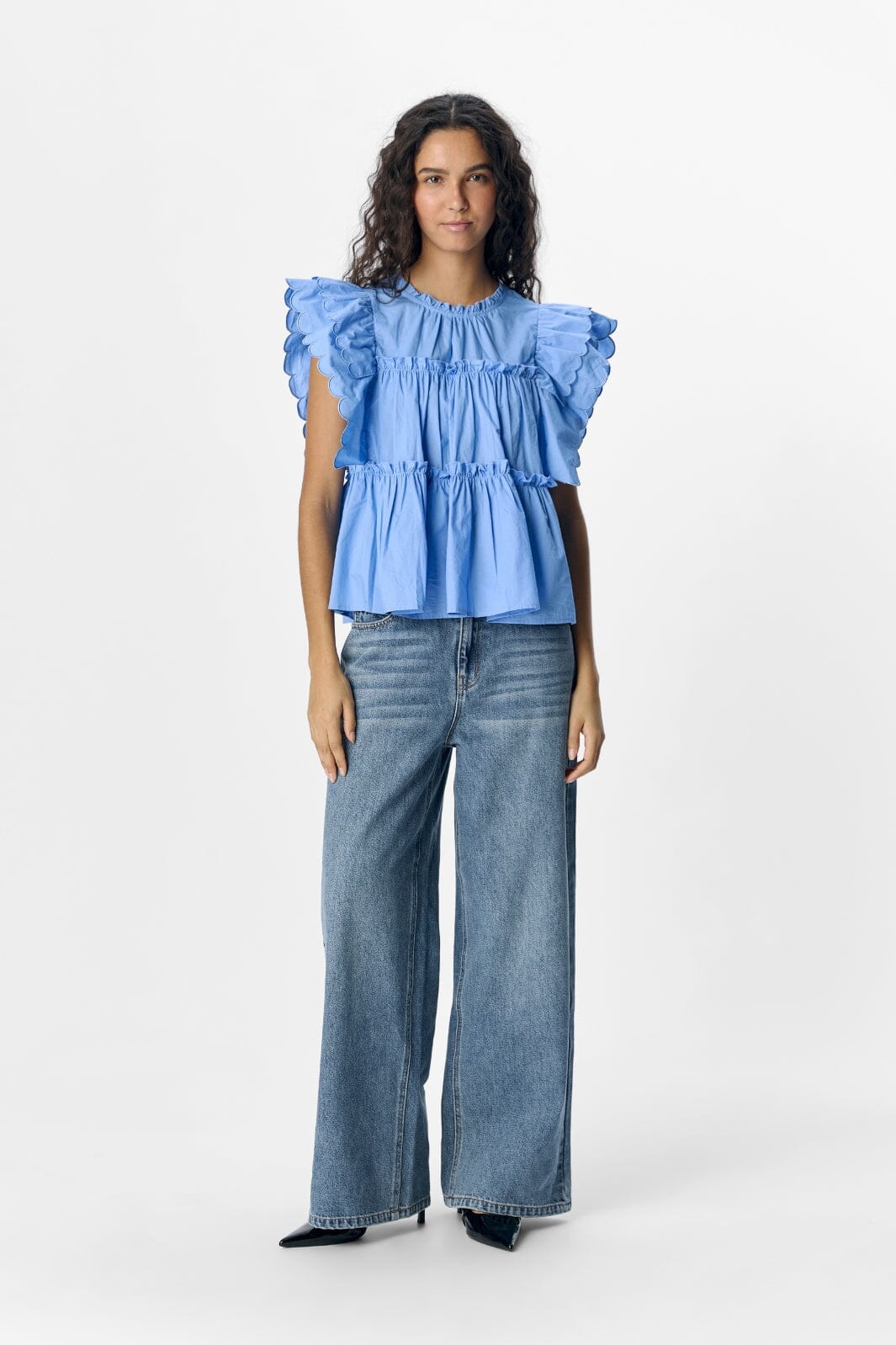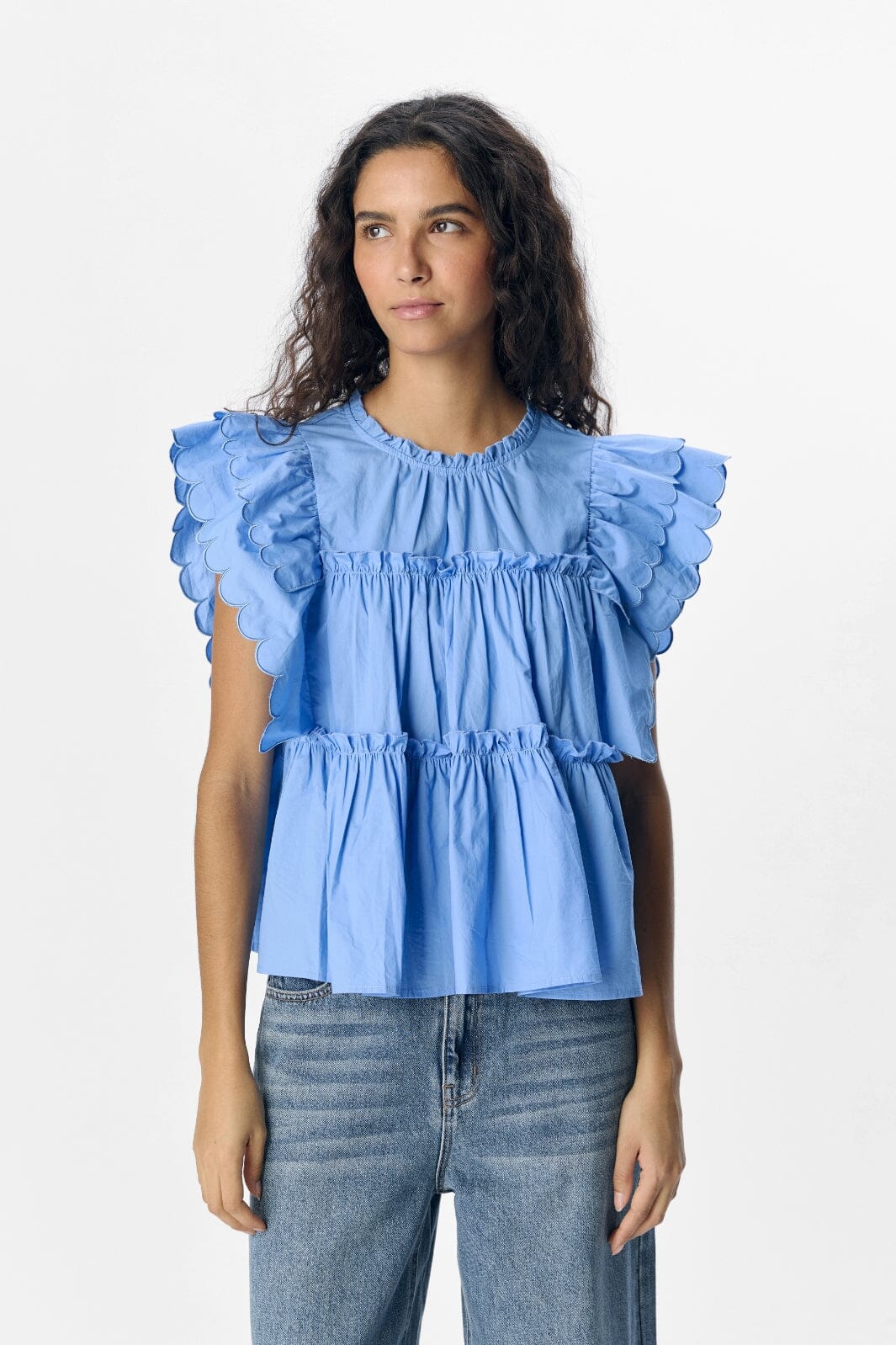 Ärmelloses Top von Object in Hellblau. Das Top hat Rüschendetails und ein geschichtetes Design mit gewellten Kanten. Der runde Ausschnitt und die Knopfverschlüsse verleihen einen schlichten Ausdruck.