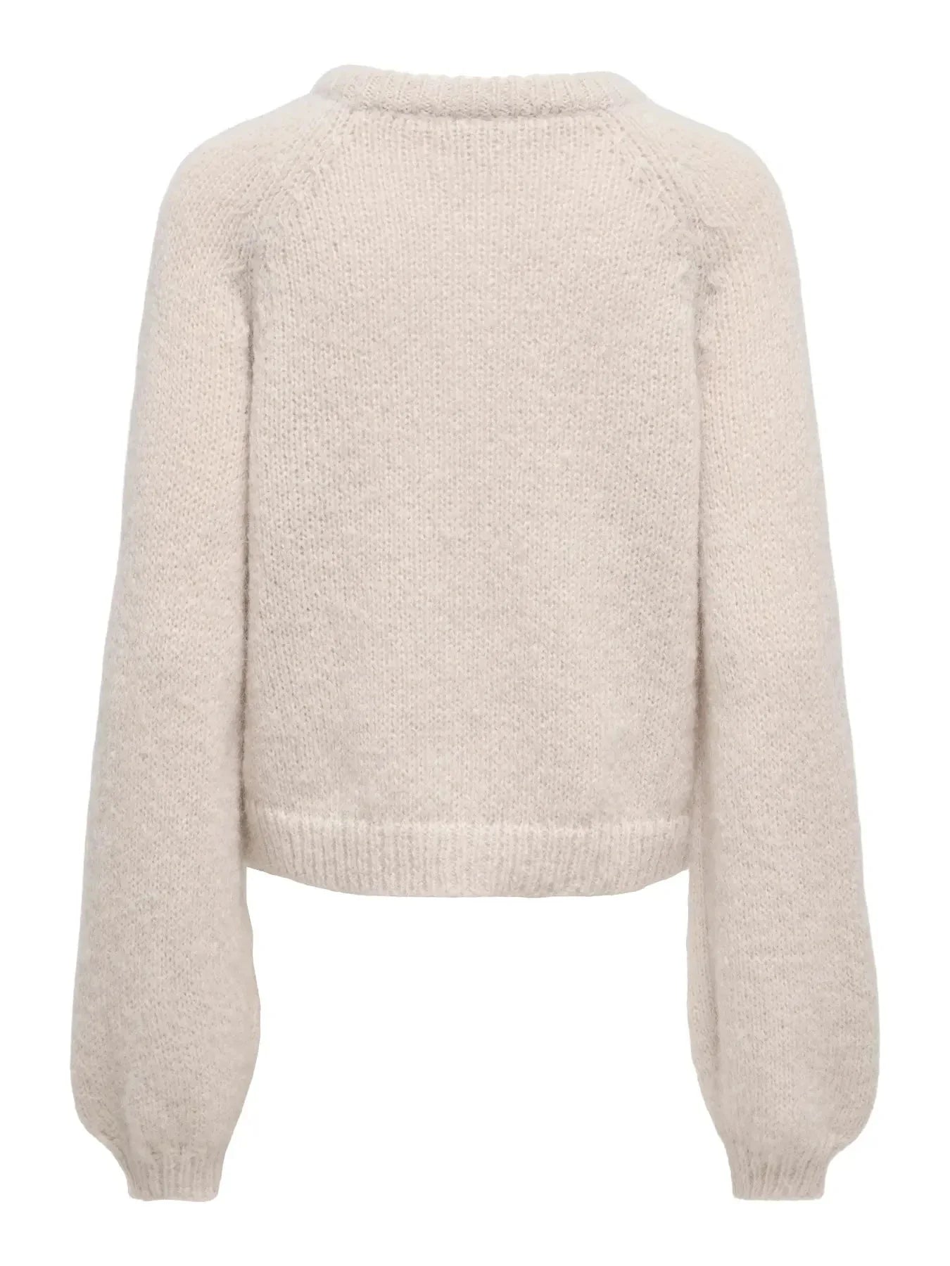 Eine Strickjacke von Only in einem hellen Beigeton. Die Strickjacke besteht aus 100 % recyceltem Polyester und hat lange Raglanärmel mit einer Knopfleiste vorn.
