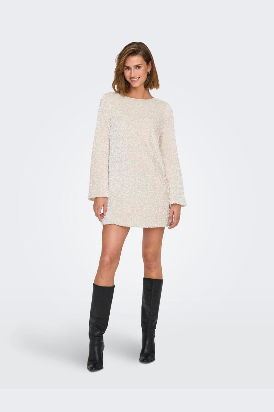 Pailletten-Kleid von Only in einem hellen Creme-Ton. Das Kleid hat lange Ärmel, die mit Pailletten bedeckt sind, und eine schwarze Schleife auf der Rückseite.