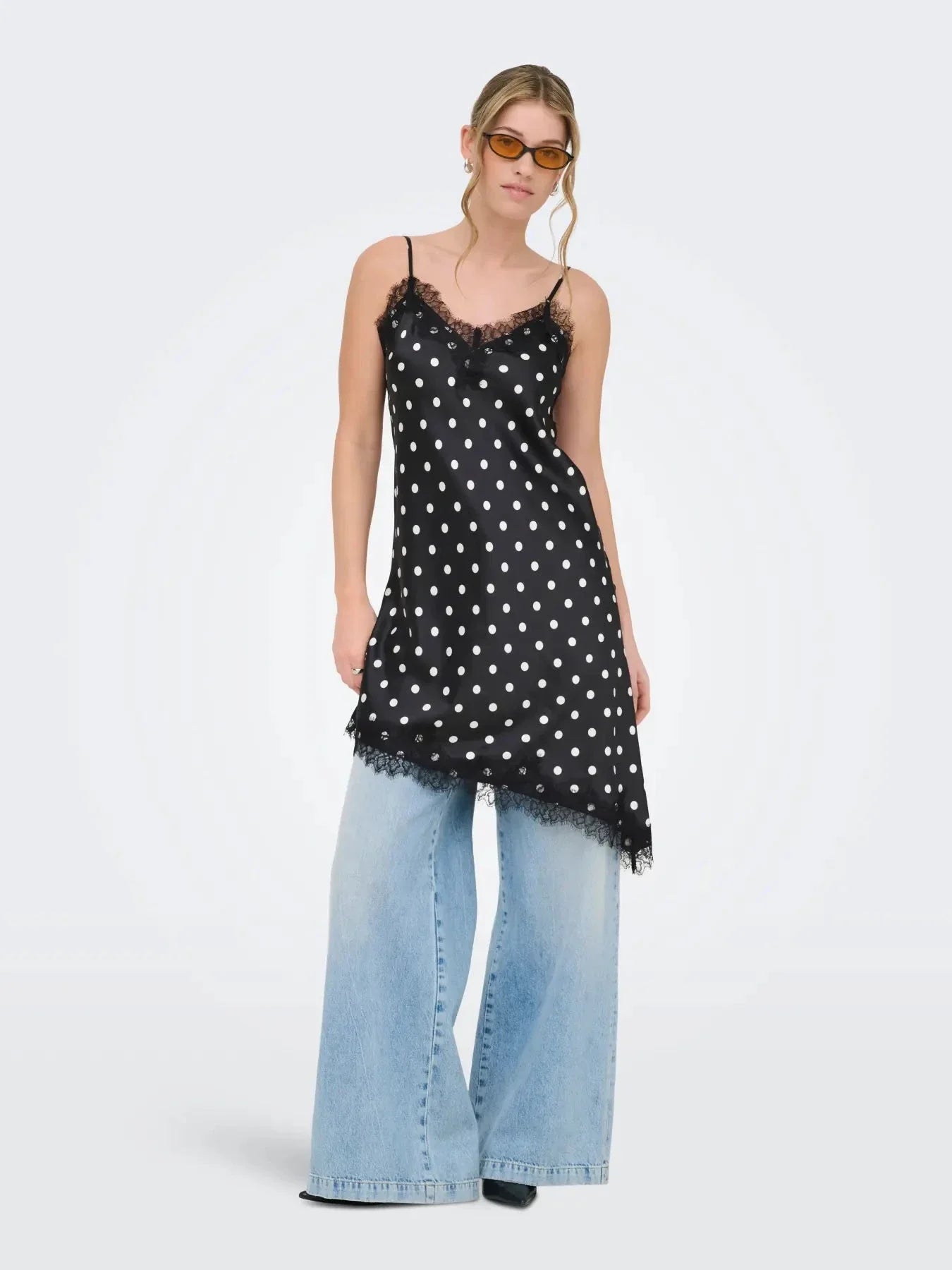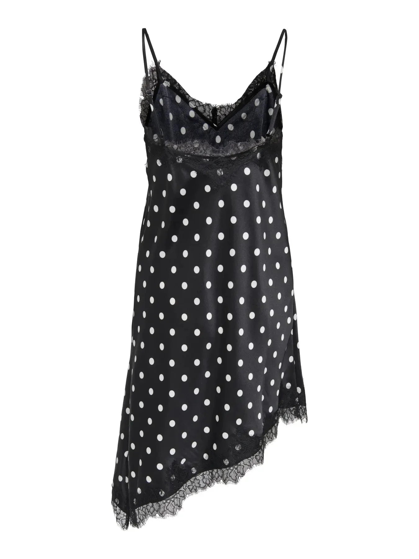 Schwarzes Satinkleid von Only mit weißen Punkten und Spitzenbesatz. Das Kleid hat dünne Spaghettiträger und einen asymmetrischen Saum mit Spitzenkante.