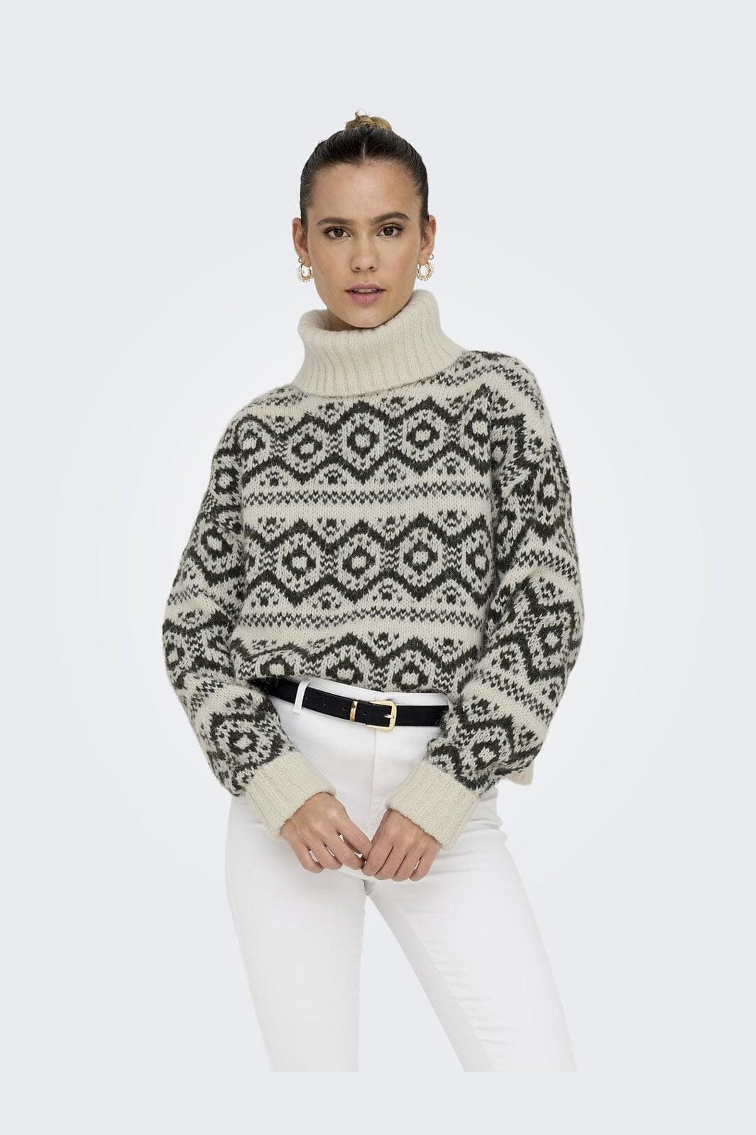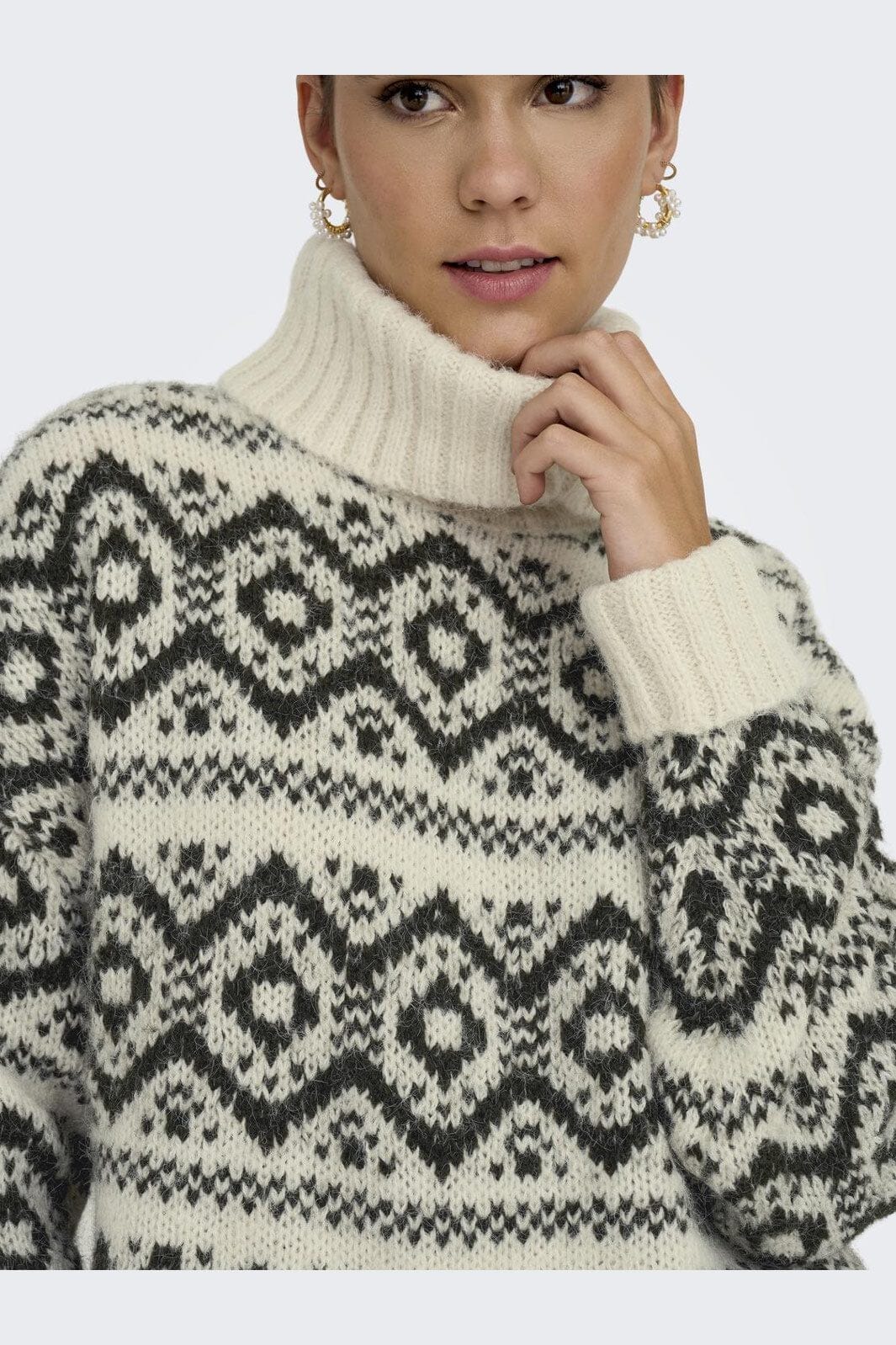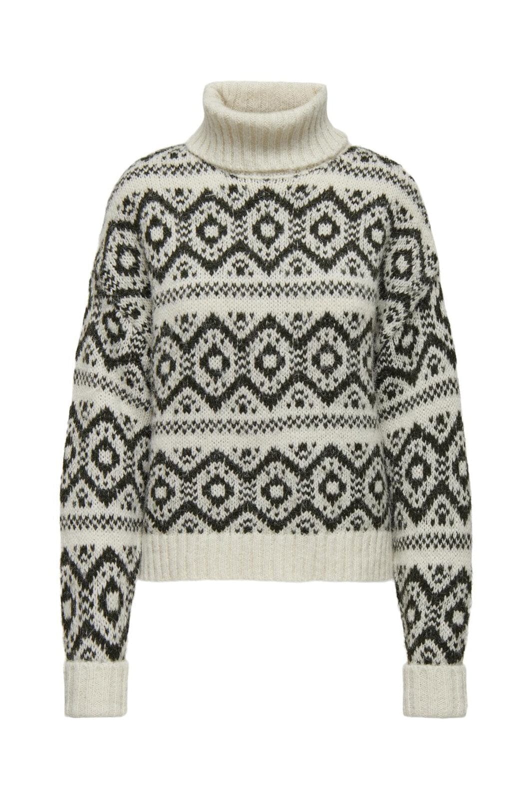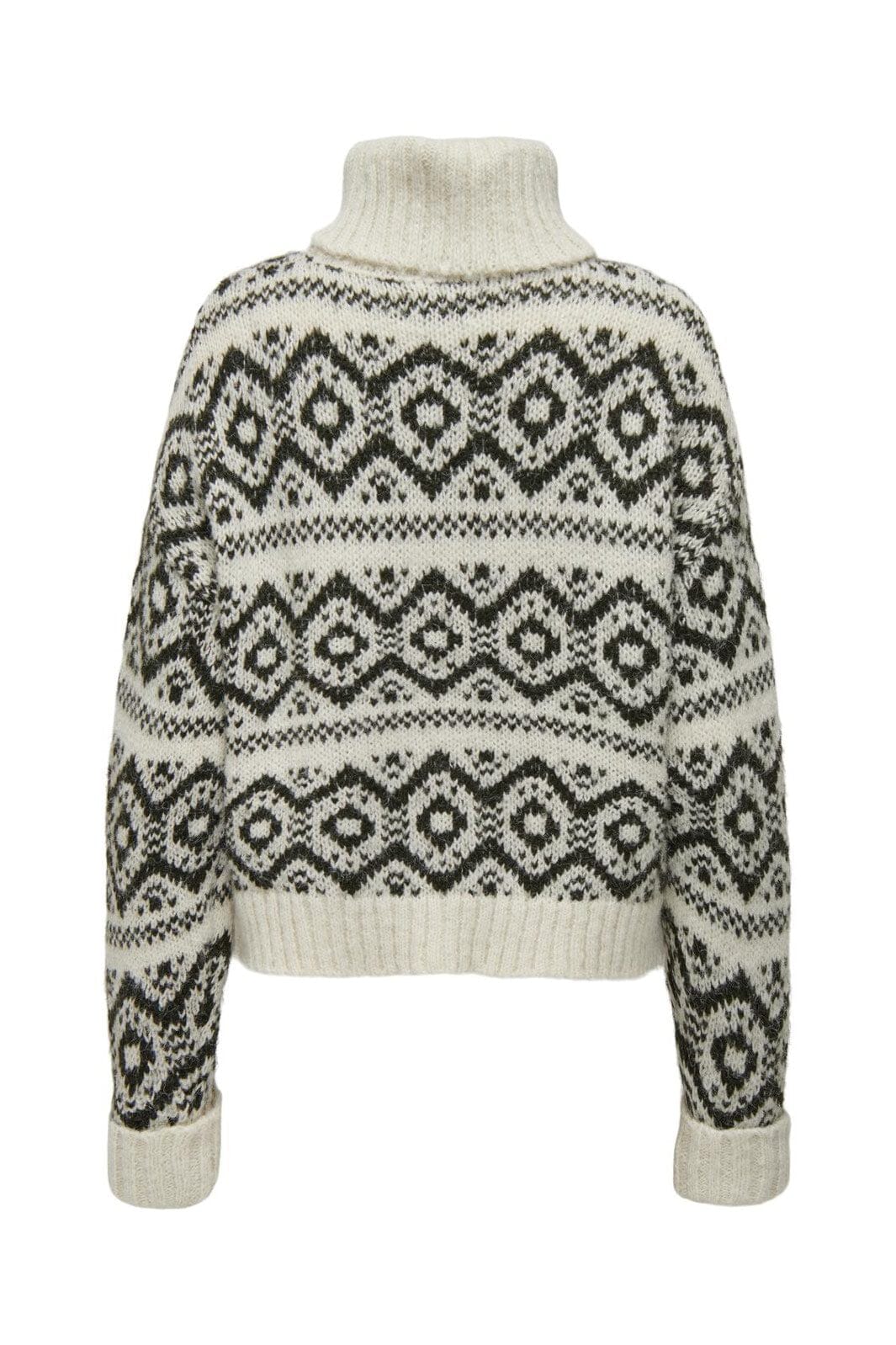Strickpullover von Only mit geometrischem Muster in Birken- und Harznuancen. Der hohe Rollkragen und die lockere Passform bieten eine gute Kombination aus Stil und Komfort.