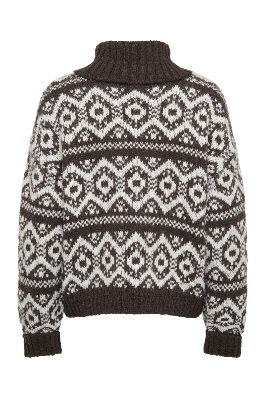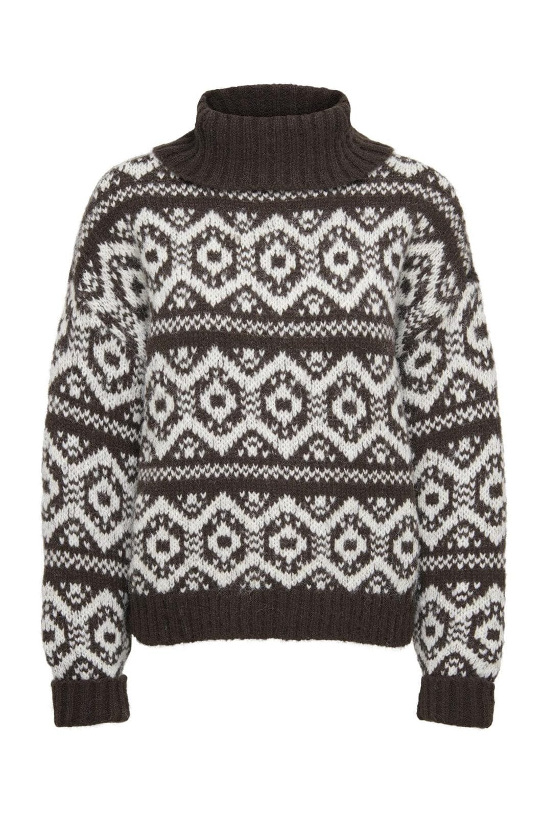 Strickpullover von Only in Dunkelbraun mit weißem geometrischem Muster. Sie hat eine lockere Passform mit gesenkten Schultern und einem hohen Rollkragen, der an kalten Tagen gut wärmt.