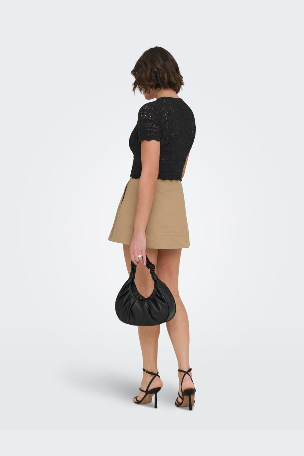 Schwarze Strickjacke von Only mit Perlenknöpfen und Muscheldetails. Die Strickjacke besteht aus recycelten Materialien und hat eine kurze, cropped Passform mit kurzen Ärmeln.