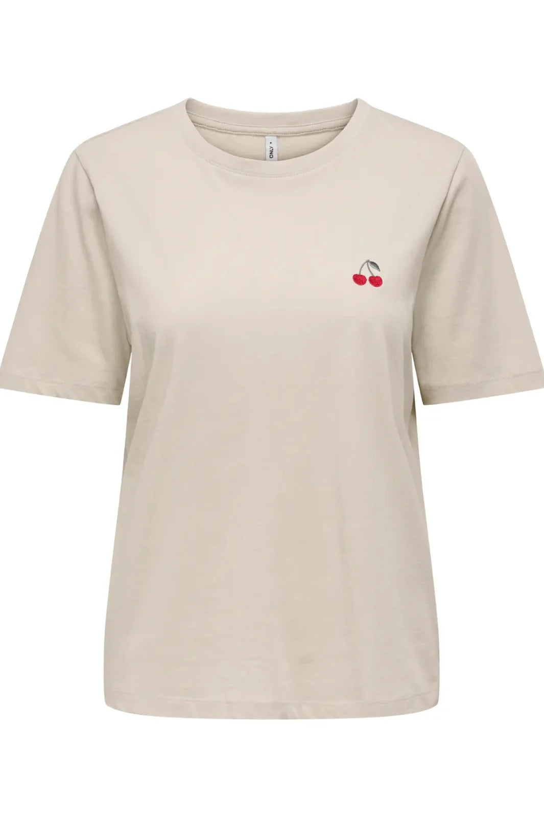 Beiges T-Shirt von Only, hergestellt aus 100 % Bio-Baumwolle. Das T-Shirt hat einen Rundhalsausschnitt und kurze Ärmel mit einer kleinen Kirschstickerei auf der Brust.
