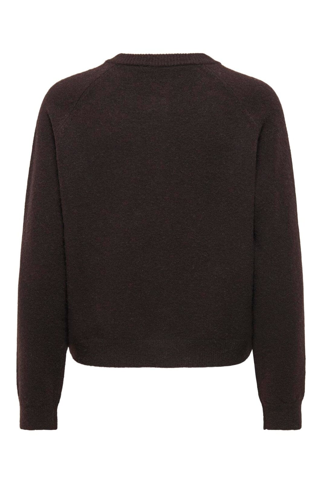 Dunkelbraune Cardigan von Only mit goldenen Schleifenkneifen entlang der Vorderseite. Die Cardigan hat lange Ärmel, einen runden Halsausschnitt und eine Regular Fit-Passform.