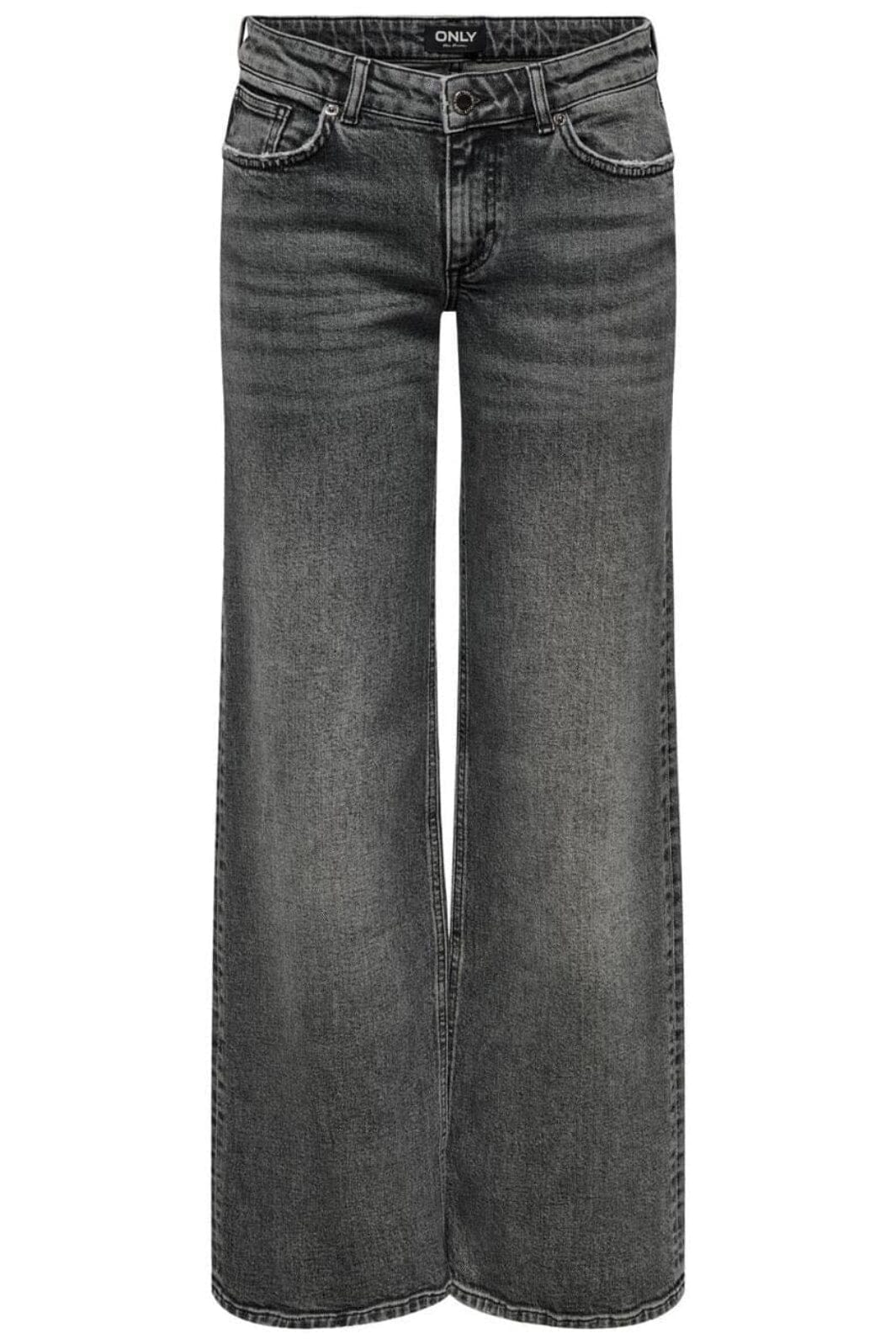 Dunkelgraue Jeans von Only mit niedriger Taille und weitem Bein. Die Hose hat Gürtelschlaufen und Taschen sowohl vorne als auch hinten. Reißverschluss im Schritt.