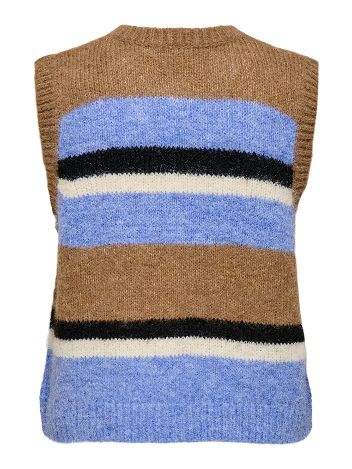 Gestreifter Weste von Only mit breiten horizontalen Streifen in Braun, Hellblau, Schwarz und Weiß. Die Weste hat schwarze Knöpfe und einen runden Halsausschnitt.