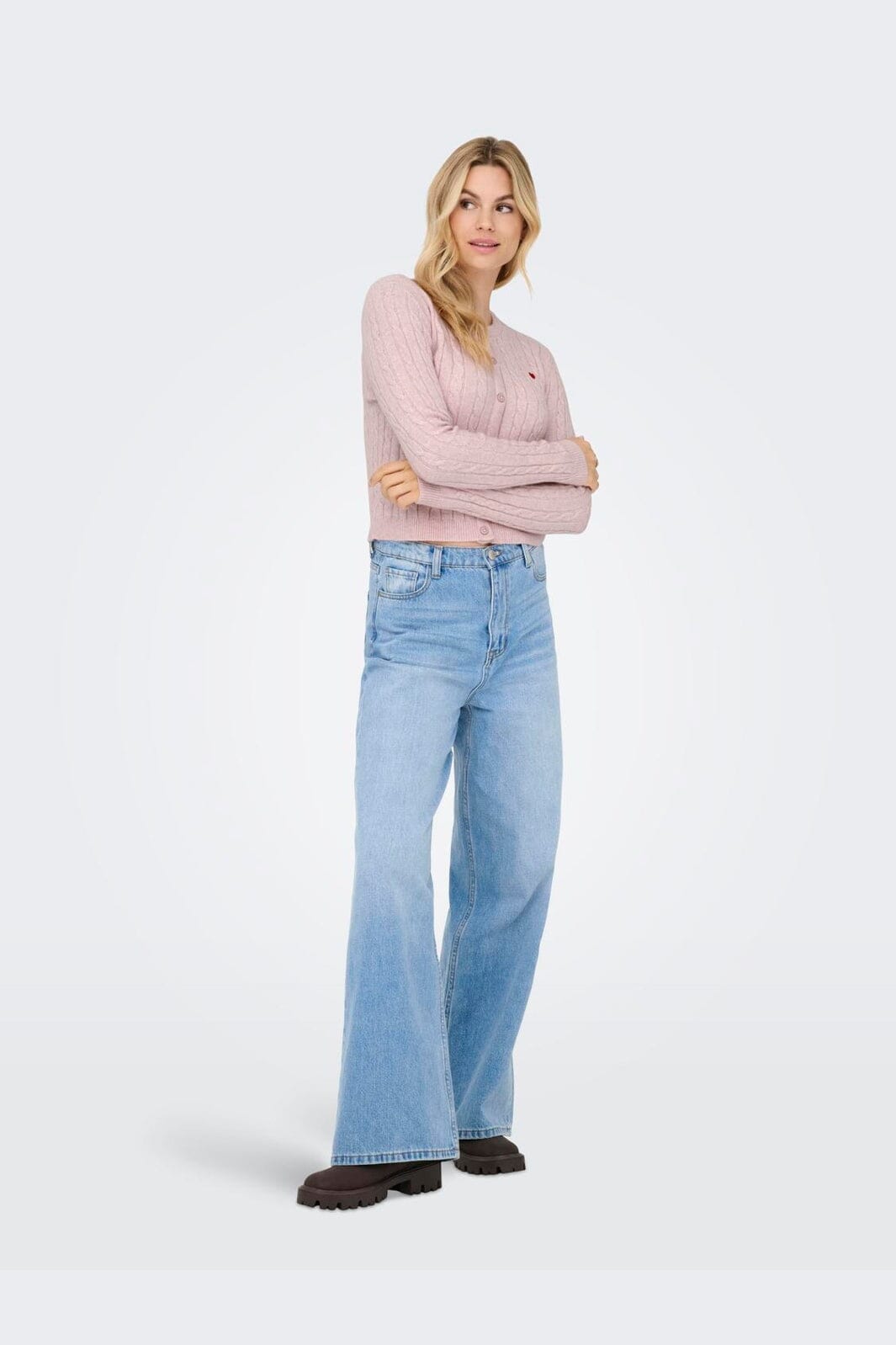 Helle lila Cardigan von Only mit Kabelstrickmuster und einer kleinen roten Herzstickerei auf der Brust. Die Cardigan hat eine Knopfleiste und ribbelgestrickte Manschetten.