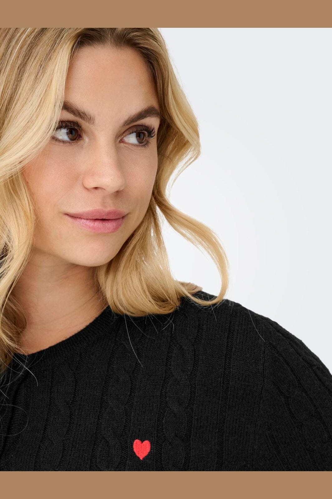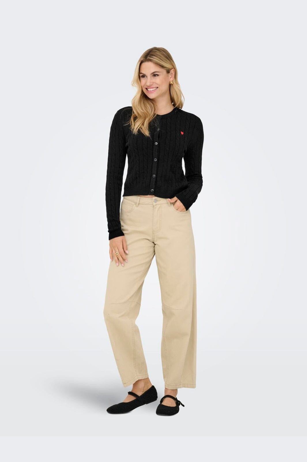 Schwarze kabelgestrickte Cardigan von Only mit Knopfleiste und kleinem roten Herzstickerei auf der linken Brust.
