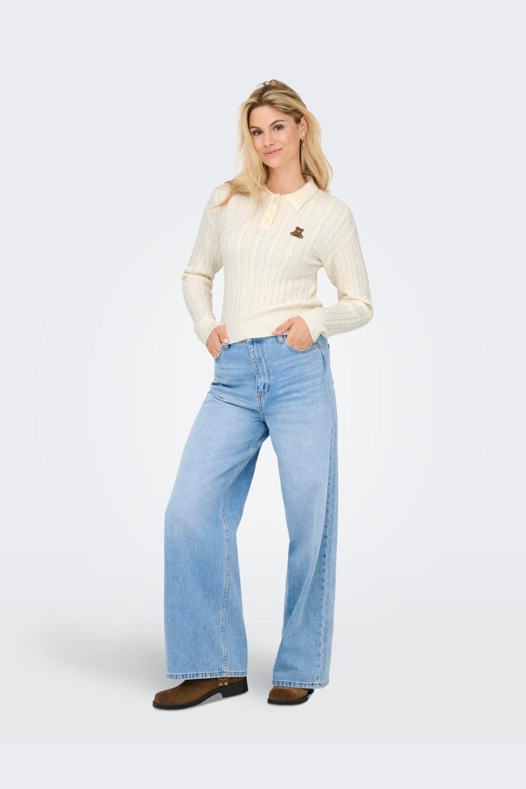 Strick-Polo von Only in einem hellen Creme-Ton. Der Pullover hat ein Kabelstrickmuster und ein gesticktes Bärenmotiv auf der Brust.